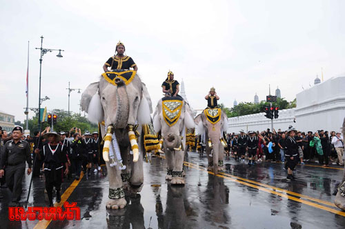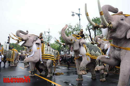 อย่างไรก็ตาม เมื่อถึงเวลาเจ้าหน้าที่วังช้างได้บรรเลงเพลงสรรเสริญพระบารมี ช้างทั้ง 11 เชือก ได้ยืนตรง ซึ่งประชาชนที่อยู่บริเวณโดยรอบได้ร่วมกันร้องเพลง และเมื่อจบเพลงช้างทุกเชือกได้ชูงวงขึ้น พร้อมหมอบลงทำท่ากราบ เพื่อแสดงความเคารพ จากนั้นได้คำรามดังเสียงดังกึกก้อง