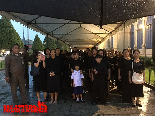8 พ.ย.59 ผู้สื่อข่าวรายงานว่า เมื่อเวลา 05.00 น. สำนักพระราชวังได้เปิดให้ประชาชนทยอยเข้ายังประตูวิเศษไชยศรี ตรงไปยังประตูวิมานไชยศรี ผ่านพระที่นั่งจักรีมหาปราสาท เพื่อเข้ากราบสักการะพระบรมศพ ถึงแม้ฝนจะตกลงมาตลอดทั้งคืนตั้งแต่ 03.00 น. จนกระทั่งช่วงเช้า 08.45 น. จึงหยุดตก แต่พสกนิกรก็ไม่ย่อท้อ ยังคงเข้าแถวอย่างเป็นระเบียบ