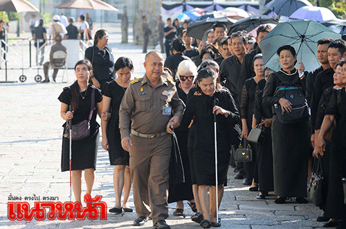 29 พ.ย.59 ผู้สื่อข่าวรายงาน บรรยากาศการเข้าถวายบังคมพระบรมศพ พระบาทสมเด็จพระปรมินทรมหาภูมิพลอดุลยเดช เบื้องหน้าพระบรมโกศ ณ พระที่นั่งดุสิตมหาปราสาท ในพระบรมมหาราชวัง ว่า เจ้าหน้าที่สำนักพระราชวัง ได้เปิดให้ประชาชนที่นั่งรถวีลแชร์ เดินทางเข้ากราบสักการะพระบรมศพ ทางประตูวิเศษไชยศรีเป็นคณะแรก ตั้งแต่เวลา 04.45 น. และในเวลา 04.50 น. เป็นประชาชนทั่วไป โดยมีประชาชนทั้งในกรุงเทพฯ และต่างจังหวัดเดินทางเข้ากราบสักการะพระบรมศพอย่างเนื่องแน่น