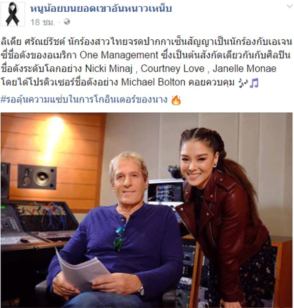 เก่งจริงๆสำหรับคุณแม่คนสวย “ลีเดีย ศรัณย์รัตน์” ที่ล่าสุดได้จรดปากกาเซ็นสัญญาเป็นนักร้องกับเอเจนซี่ชื่อดังของอเมริกา One Management ซึ่งเป็นต้นสังกัดเดียวกันกับศิลปินชื่อดังระดับโลกอย่าง Nicki Minaj , Courtney Love , Janelle Monae โดยเธอได้โปรดิวเซอร์ชื่อดังอย่าง ไมเคิล โบล์ตัน เจ้าของรางวัล Grammy Awards คอยควบคุม