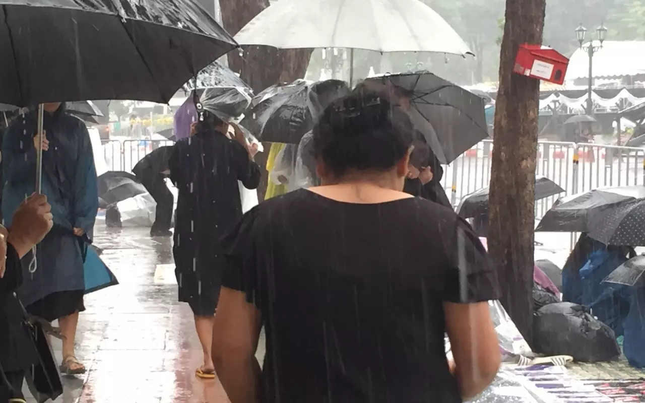 รอยเตอร์ ระบุว่า คนไทยไม่หวาดหวั่นต่อสายฝนท่ีตกกระหน่ำลงมาอย่างหนัก ในการยืนหยัดจับจองพื้นที่รอบสนามหลวงมาตั้งแต่หลายวัน เพื่อต้องการมั่นใจว่าพวกตนจะได้เข้าร่วมในพระราชพิธีถวายพระเพลิงพระบรมศพ ขณะที่โรงแรมต่างๆ ในบริเวณใกล้เคียงท้องสนามหลวงต่างถูกจองเต็มหมดไปตั้งแต่หลายสัปดาห์ก่อนแล้ว ขณะที่คาดว่าจะมีประชาชนจำนวนมากถึงราว 250,000 คนมาร่วมในพระราชพิธีถวายพระเพลิงพระบรมศพ ในหลวง ร.9