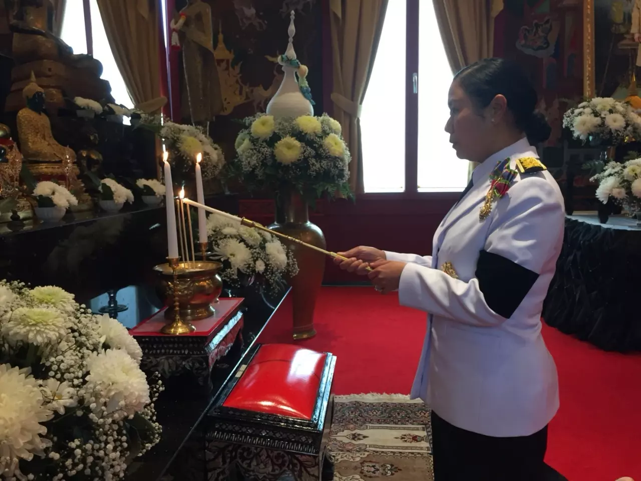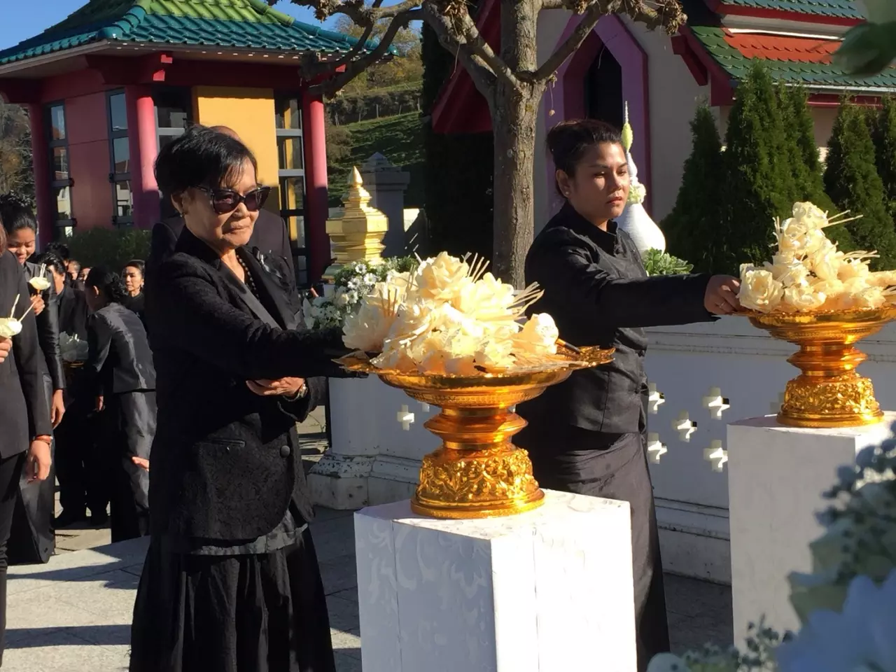 ส่วนภาคบ่ายเวลา 13.00 น. เริ่มพิธีถวายดอกไม้จันทน์ มีข้าราชการ พสกนิกรชาวไทยในสวิตฯ และประเทศใกล้เคียงได้เดินทางมาเข้าแถวถวายดอกไม้จันทน์ ต่อหน้าพระบรมฉายาลักษณ์ ไปจนถึงเวลา 17.00 น. เป็นเสร็จพิธี ในงานนี้มีผู้มีจิตศรัทธากลุ่มคนไทยและจิตอาสามาร่วมทำโรงทานเลี้ยงอาหารแก่ผู้มาร่วมงานกันตลอดทั้งวัน งานนี้มีคนไทยและชาวต่างชาติมาร่วมงานประมาณ 3,000 คน.