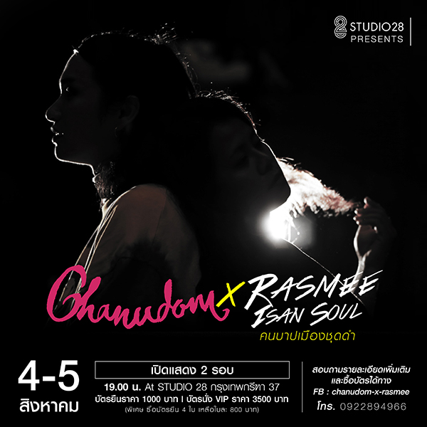 คอนเสิร์ต “คนบาปเมืองชุดดำ” จะจัดแสดงในวันที่ 4 และ 5 สิงหาคมนี้ตั้งแต่เวลา 17.00 เป็นต้นไป ที่ Studio28 ซอยกรุงเทพกรีฑา 37 ราคาบัตรยืนราคา 1000 บาท*** พิเศษ ซื้อ 4 ใบพร้อมกัน จากบัตรราคา 1000 บาทลดเหลือ 800 บาทราคาบัตรนั่ง VIP 3500 บาท ** ฟรี แชมเปญและไวน์ตลอดการแสดง + CD บันทึกเสียงการแสดงสด (Audio) จากงานนี้หมายเหตุ : รับจำนวนจำกัด VIP เพียงแค่ 30 ที่นั่ง ต่อรอบเท่านั้นสามารถจองบัตรได้ในเพจของ https://www.facebook.com/chanudomxrasmeeโดยติดต่อได้ทาง Inbox หรือ สอบถามรายละเอียดเพิ่มเติมโทร 092-289-4966 | Line: studio28