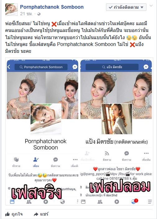 ตกเป็นเหยื่อของมิจฉาชีพอีกคนแล้ว สำหรับลูกสาวคนสวยของพระเอกลิเกเงินล้าน “แป้ง มิตรชัย” หรือ“พรภัสร์ชนก มิตรชัย” ที่ล่าสุดได้ออกมาชี้แจงผ่านเฟซบุ๊กส่วนตัว Pornphatchanok Somboon ถึงกรณีโดนแอบอ้างเฟซบุ๊กเป็นตัวเองไปเม้นท์หาศิลปินท่านอื่น จน “เอ ไชยา” ต้องต่อสายตรงโทรถามลูกสาวว่าทำไมไปเม้นท์แบบนั้น? โดย สาวแป้ง ระบุว่า