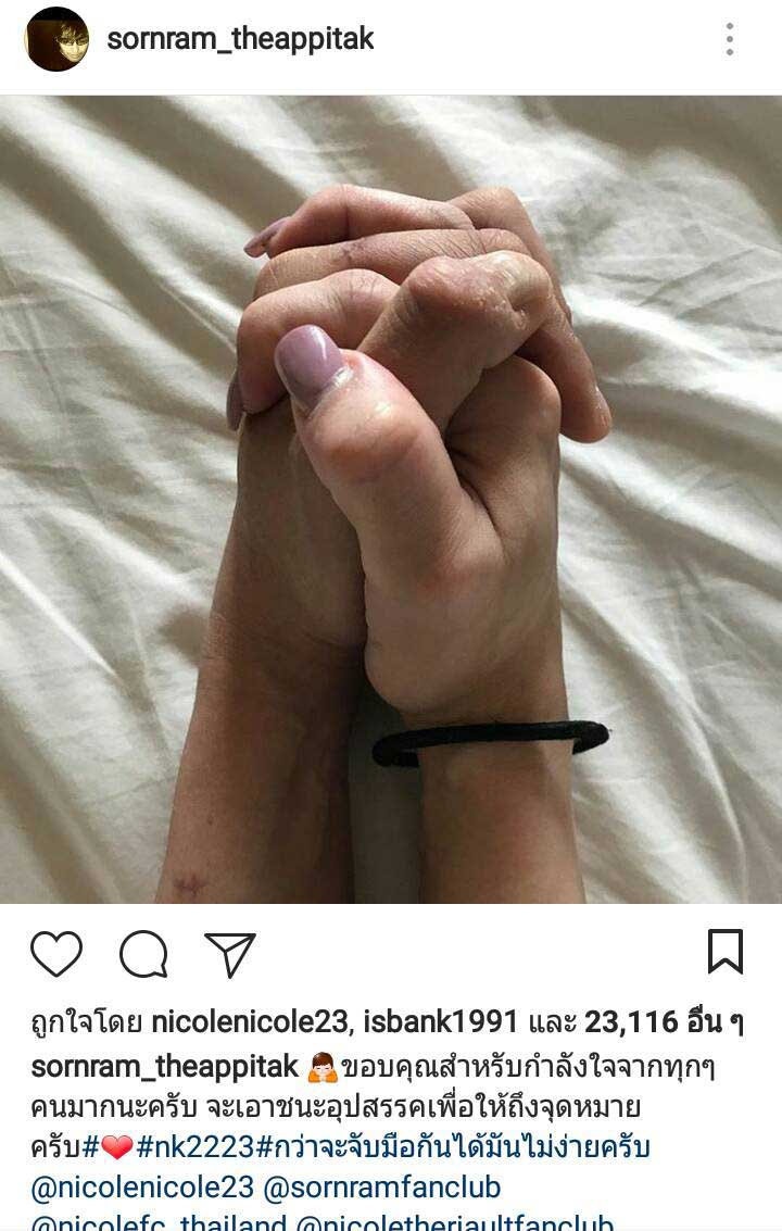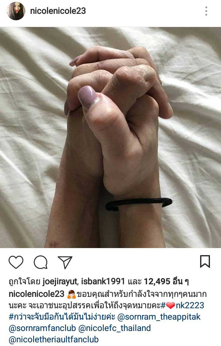 ล่าสุดทั้งสาวนิโคล และ หนุ่ม ศรราม ก็ได้โพสต์ภาพเดียวกันบนอินสตาแกรม มือของทั้งสองจับประสานกันไว้อย่างแนบแน่น พร้อมระบุข้อความว่า “ขอบคุณสำหรับกำลังใจจากทุกๆคน จะเอาชนะอุปสรรคเพื่อให้ถึงจุดหมาย #nk2223 #กว่าจะจับมือกันได้มันไม่ง่าย “