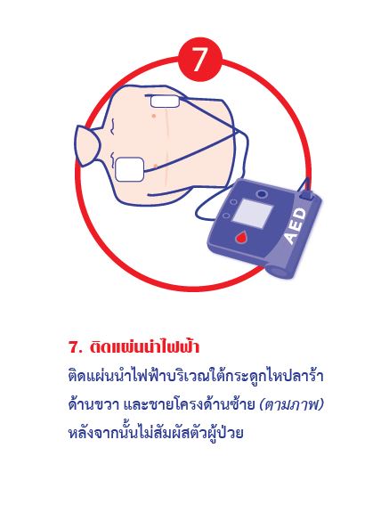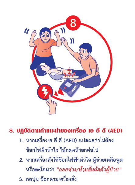 8.ปฏิบัติตามที่เครื่อง AED แนะนำ จนกว่าทีมกู้ชีพ จะมาถึง และ ส่งต่อผู้ป่วยให้กับทีมกู้ชีพเพื่อนำส่งโรงพยาบาล เพียงเท่านี้ก็จะช่วยให้ผู้ป่วยฉุกเฉินมีโอกาสรอด และปลอดภัย