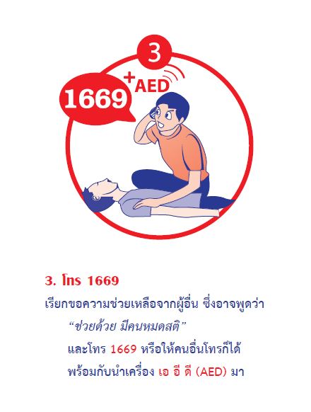 3.โทรขอความช่วยเหลือที่สายด่วน 1669 พร้อมร้องขอเครื่อง AED ที่อยู่ใกล้