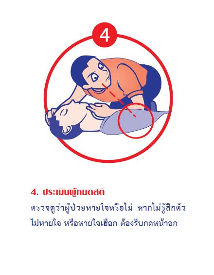 4.ประเมินผู้ป่วย หากไม่รู้สึกตัว ไม่หายใจ ให้ทำการช่วยเหลือฟื้นคืนชีพทันที