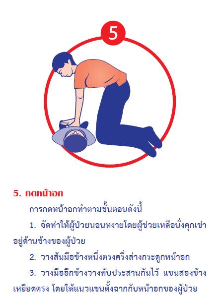 5.ช่วยเหลือฟื้นคืนชีพ ด้วยการกดหน้าอก จัดท่าให้ผู้ป่วยนอนหงาย วางส้นมือข้างหนึ่งตรงครึ่งล่างของกึ่งกลางกระดูกหน้าอก และวางมืออีกข้างทับประสานกันไว้ เริ่มการกดหน้าอก ด้วยความลึกอย่างน้อย 5 เซนติเมตร ในอัตราเร็ว 100-120 ครั้งต่อนาที