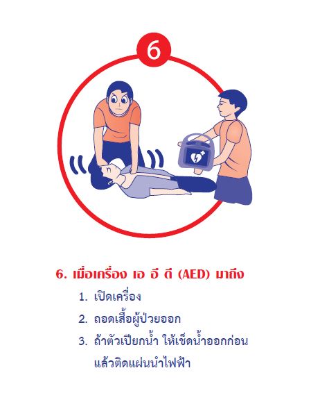 6.เมื่อเครื่องAED มาถึง ให้เปิดเครื่อง และเปิดเสื้อผู้ป่วยออก และทำตามที่เครื่อง AED แนะนำ