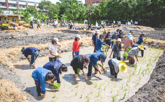 ทั้งนี้ ในวันแถลงข่าวเปิดตัวโครงการได้มีการประเดิม “เอามื้อสามัคคี” เป็นแห่งแรก ณ แปลงเกษตรสาธิตคณะเทคโนโลยีการเกษตร สถาบันเทคโนโลยีพระจอมเกล้าเจ้าคุณทหารลาดกระบัง (สจล.) ที่ออกแบบและปรับปรุงเพื่อสร้างเป็นแหล่งเรียนรู้สำหรับการทำเกษตรในเมืองแก่ประชาชนต่อไปในอนาคต ตามแนวคิด ‘เพลิน เอเรีย’ มาจากคำว่า เพลย์(Play)+เลิร์น (Learn) เป็นแปลงเกษตรที่รวบรวมองค์ความรู้ด้านเทคโนโลยีการเกษตร และแปรรูปวัตถุดิบเพื่ออุตสาหกรรมการเกษตร เพื่อให้ผู้เข้าชมมีความสุขจากการเข้ามาสัมผัสภายในสวนแห่งนี้ โดยมีนิสิตจากคณะเทคโนโลยีการเกษตร สจล. เครือข่ายยุวเกษตรโยธิน พนักงานเอกชน และประชาชนทั่วไป มาร่วมกันลงแขกเอามื้อสามัคคี