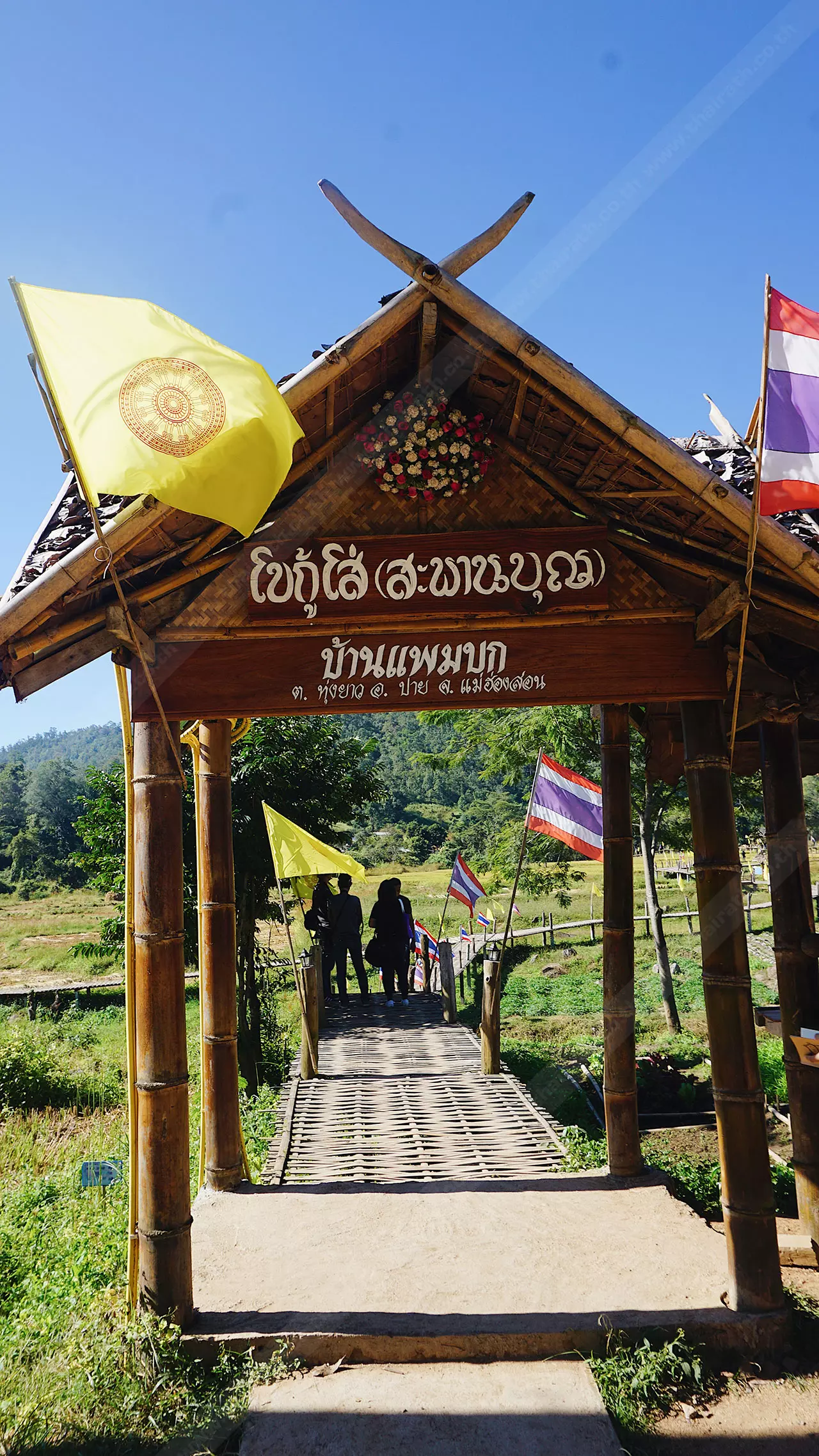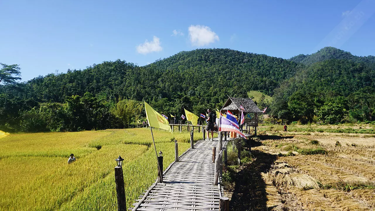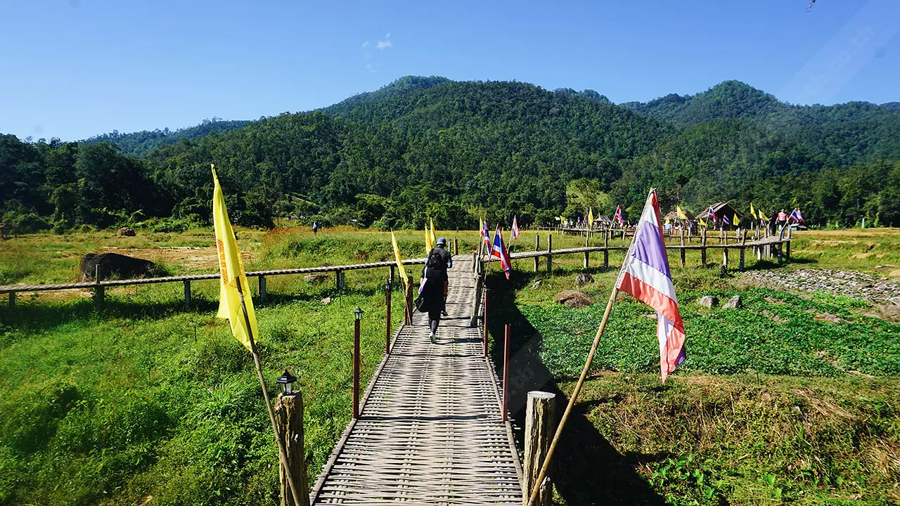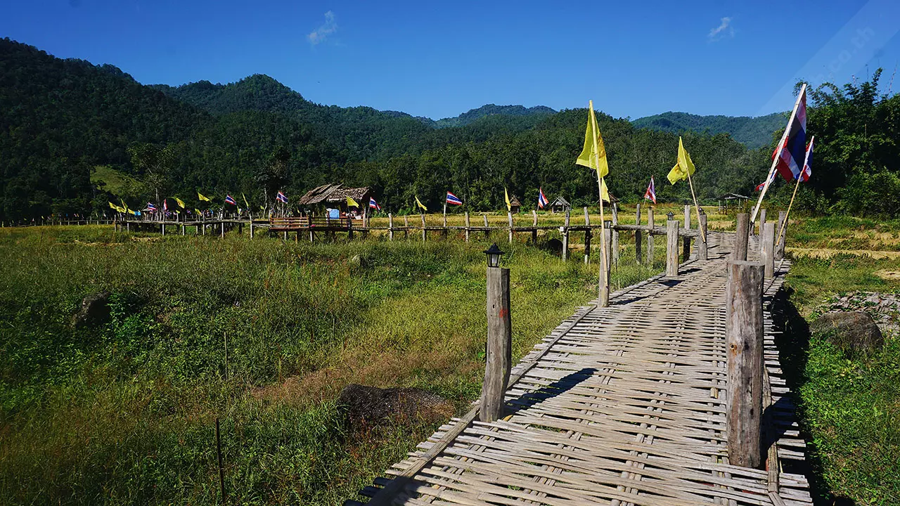 สะพานนี้เชื่อมระหว่างพุทธอุทยานห้วยคาย ชุมชนและวัดแพมบก ชาวบ้านมีความเชื่อว่าการสร้างสะพานคือการต่ออายุ เพราะชาวไทใหญ่เชื่อว่าจะต่ออายุทุกคนในครอบครัว จึงร่วมแรงร่วมใจกันสร้างขึ้นมา ที่ปัจจุบันเป็นที่ดินของชาวบ้านที่บริจาคโครงการสร้างทำจากไม้ไผ่ เสาเป็นปูนและเสริมโครงเหล็ก แนวสะพานจะลัดเลาะตามคันนา ขนาดกว้าง 1.50 เมตร