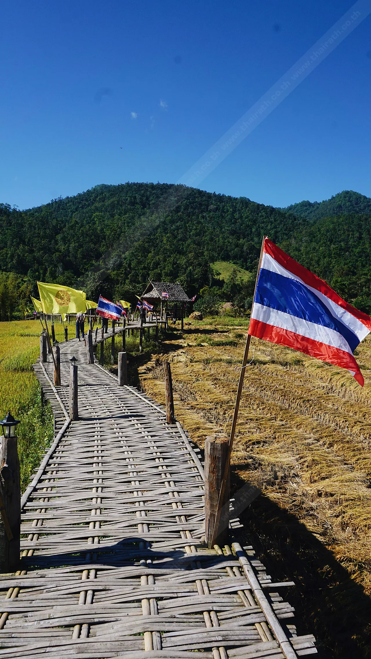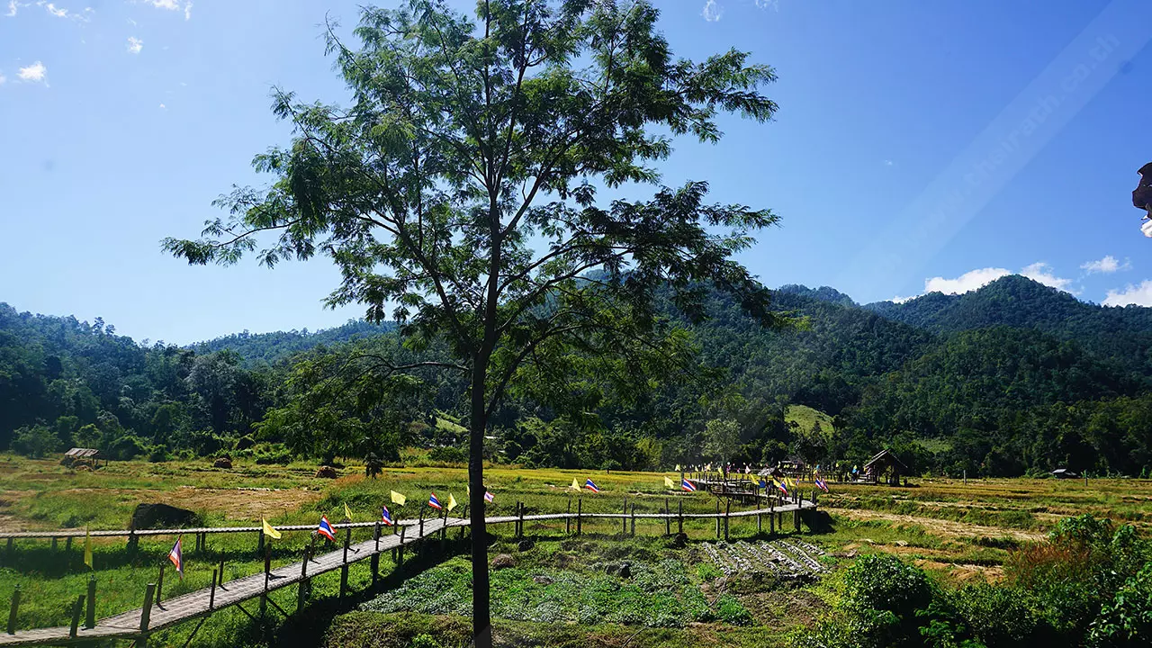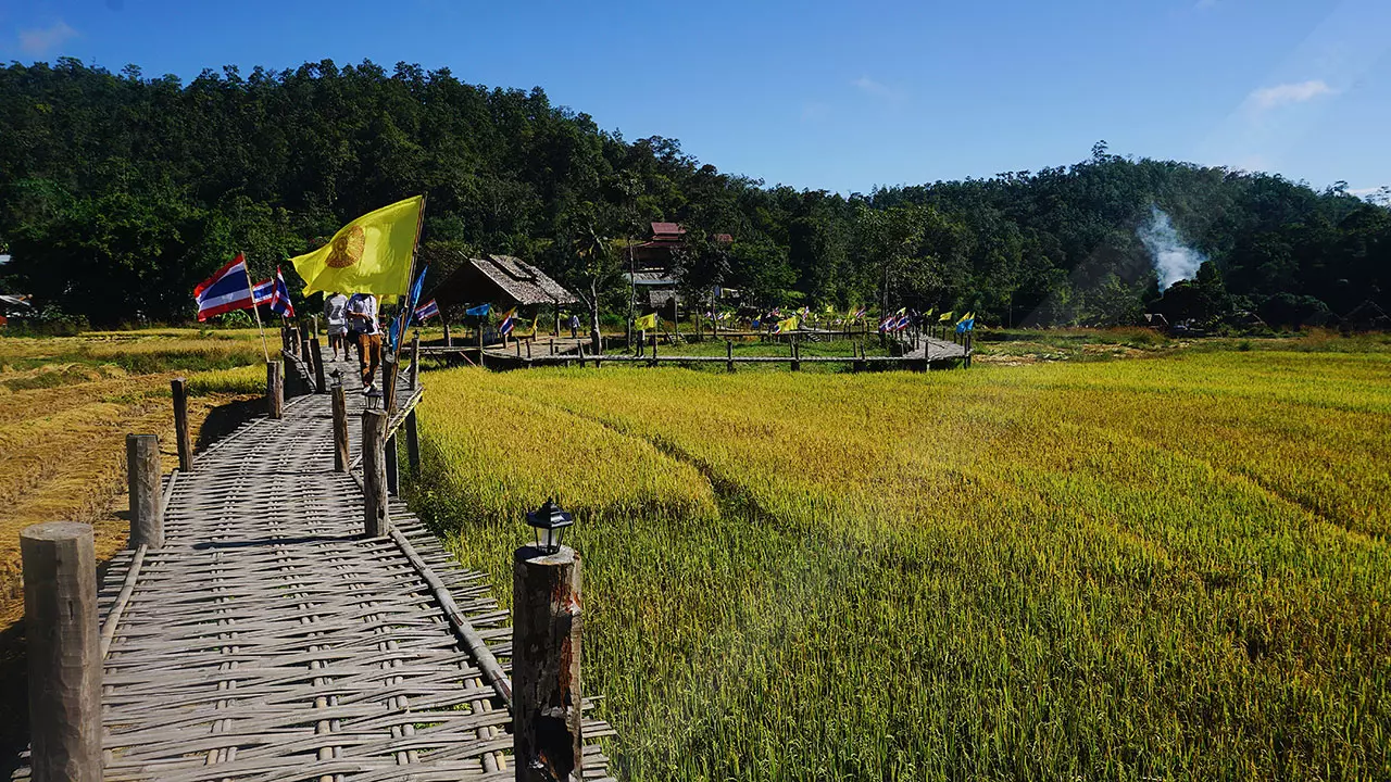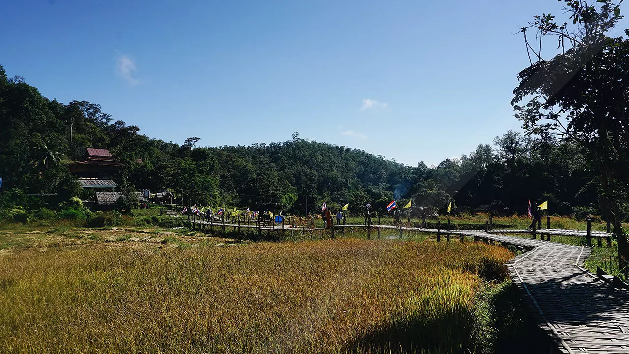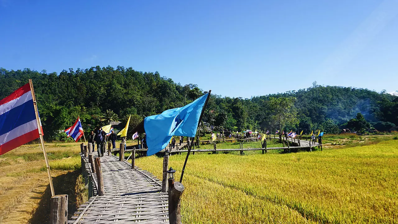 สะพานนี้เชื่อมระหว่างพุทธอุทยานห้วยคาย ชุมชนและวัดแพมบก ชาวบ้านมีความเชื่อว่าการสร้างสะพานคือการต่ออายุ เพราะชาวไทใหญ่เชื่อว่าจะต่ออายุทุกคนในครอบครัว จึงร่วมแรงร่วมใจกันสร้างขึ้นมา ที่ปัจจุบันเป็นที่ดินของชาวบ้านที่บริจาคโครงการสร้างทำจากไม้ไผ่ เสาเป็นปูนและเสริมโครงเหล็ก แนวสะพานจะลัดเลาะตามคันนา ขนาดกว้าง 1.50 เมตร