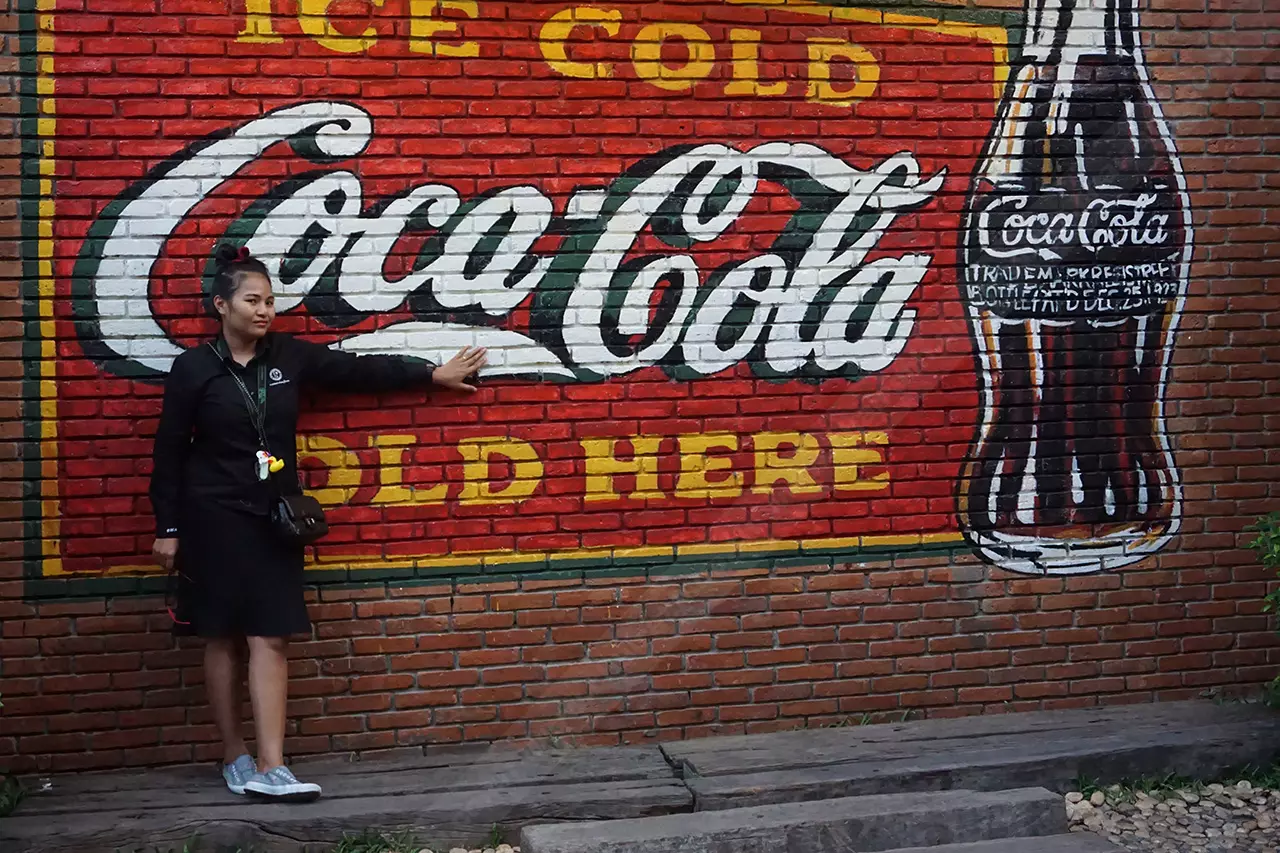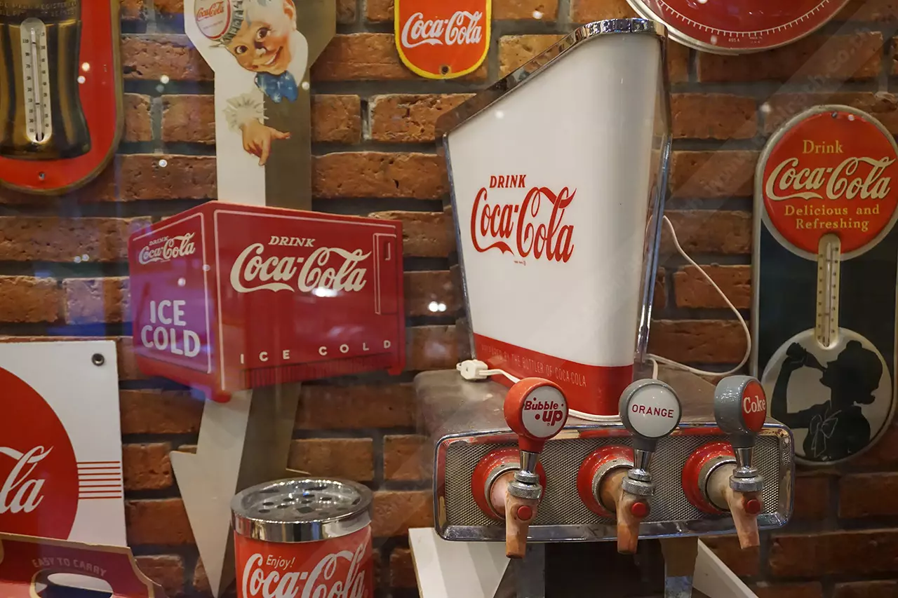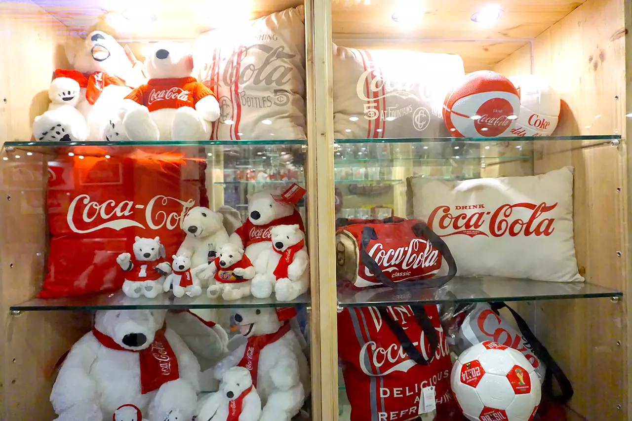 เดินมาอีกแค่ 2-3 ก้าว ก็เจอ ‘โซนบ้านโค้ก’ อยู่ด้านซ้ายมือ สังเกตง่ายๆ จะมีรูปวาดเป็นสัญลักษณ์โค้กอยู่ที่ผนัง คนมาต่อคิวถ่ายรูปเพียบ ส่วนด้านในเขาจัดทำเป็นพิพิธภัณฑ์โค้ก มีทั้งเครื่องกดน้ำอัดลมโบราณ ขวดโค้กโบราณจากประเทศต่างๆ ของที่ระลึก และโมเดลรถแบรนด์โค้กหลากหลายรูปแบบ มีชั้นสองให้ขึ้นไปชมความอลังการจากด้านบนได้ด้วย แจ่มเลย!