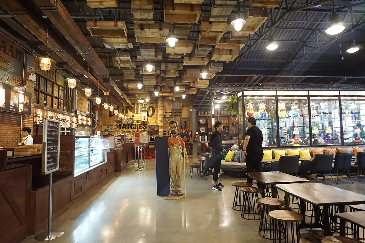 ถัดมาเราเดินต่อไปยัง ‘โซนร้านกาแฟวินเทจ’ เปิด 24 ชม. ที่นี่เป็นห้องโถงกว้างขวาง โปร่งโล่งสบายในสไตล์ลอฟต์ มีโต๊ะที่นั่งให้เลือกพักผ่อนหลากมุมหลายสไตล์มากๆ เช่น ชุดโซฟา ชุดโต๊ะวินเทจ โต๊ะไม้โซนเอาต์ดอร์ใกล้ชิดธรรมชาติ เขาบริการเค้กอร่อยๆ และเครื่องดื่มซอฟต์ดริงก์ กาแฟหอมๆ ชาร้อน ชาเย็นรสชาติดี เป็นต้น