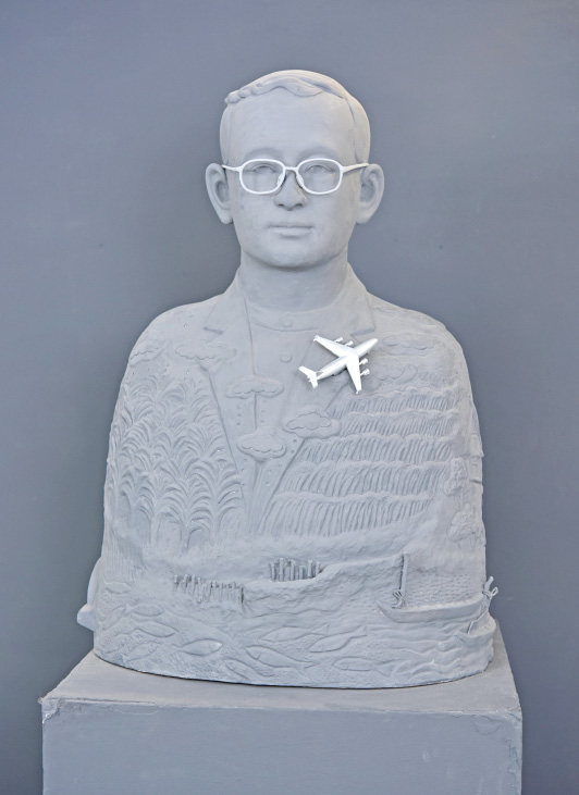 สำหรับนิทรรศการครั้งนี้เป็นการจัดแสดงผลงานชิ้นเอกของแผนกช่างเครื่องเคลือบดินเผา จากเหล่าคณาจารย์และนักเรียน โดยรังสรรค์ผลงานชิ้นพิเศษขึ้นมา อาทิ “ตามรอยพระราชา” ผลงานการรังสรรค์ของ อาจารย์กิตติชัย สุขสุเมฆ แผนกช่างเครื่องเคลือบดินเผา ศูนย์ศิลปาชีพบางไทรฯ ผลงานชิ้นเอกที่สร้างสรรค์ขึ้นมาเพื่อจัดแสดงและจำหน่ายภายในงานโดยเฉพาะ ซึ่งเป็นผลงานการปั้นที่แตกต่างจากงานปั้นทั่วไป เพราะผลงาน “ตามรอยพระราชา” เป็นงานปั้นที่ไม่ใช้ดิน แต่ใช้ซีเมนต์เป็นวัสดุหลักปั้นพระบรมรูปของพระบาทสมเด็จพระปรมินทรมหาภูมิพลอดุลยเดช โดยมีรายละเอียดปลีกย่อยที่ได้แรงบันดาลใจมาจากงานในโครงการพระราชดำริต่างๆ ของพระองค์ท่านที่ทรงงานเพื่อพสกนิกรชาวไทยไว้มากมาย อาทิ โครงการเรื่องกังหันลม, หญ้าแฝก, ฝายทดน้ำ, ฝนเทียม ฯลฯ อยู่ตรงส่วนที่ปั้นเป็นฉลองพระองค์ของพระองค์ท่าน ซึ่งการนำซีเมนต์มาเป็นวัสดุหลักนั้นเป็นเทคนิคใหม่ที่นำมาใช้ในงานปั้น ซึ่งช่วยเรื่องความแข็งแรงทนทานมากขึ้น ให้สีสันที่แตกต่าง โดยจำหน่ายในราคา 300,000 บาท
