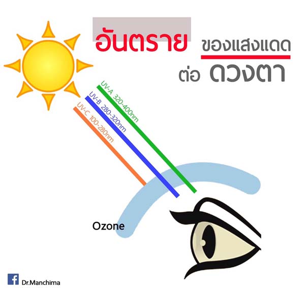 รศ.แพทย์หญิงมัญชิมา มะกรวัฒนะผู้อำนวยการศูนย์จักษุรักษ์ตา ชั้น 2 ไลฟ์เซ็นเตอร์ (อาคารคิวเฮ้าส์ ลุมพินี) ได้อธิบายเรื่องแสงแดดว่า แสงแดดจะประกอบด้วยรังสีอัลตร้าไวโอเลต(ultraviolet) หรือที่เราเรียกสั้นๆว่า รังสียูวี (UV rays) ซึ่งเป็นคลื่นแสงที่มีความยาวคลื่นสั้นกว่าแสงที่มองเห็นด้วยตา กล่าวคือ แสงที่มองเห็นด้วยตามีความยาวคลื่น 400-700 นาโนเมตรรังสียูวีจึงมีความยาวคลื่นสั้นกว่า 400 นาโนเมตรมีพลังงานสูง และไม่สามารถมองเห็นด้วยตาเปล่าถ้าได้รับรังสียูวีในความเข้มสูง จะส่งผลให้เกิดกระจกตาอักเสบ มีอาการแสบตา น้ำตาไหล แพ้แสง ตาแดงส่วนระยะยาวจะเกิดต้อลม ต้อกระจก ในอนาคตจอตาอาจเสื่อมได้
