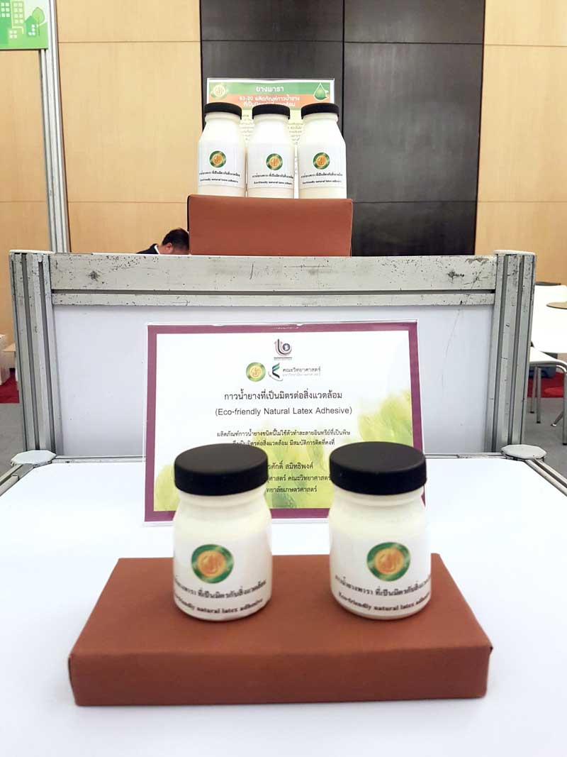 ดร.วีรศักดิ์ สมิทธพงศ์ นักวิจัยจากศูนย์เชี่ยวชาญเฉพาะทางวัสดุยางและพอลิเมอร์เพื่อการเกษตรและอุตสาหกรรมเกษตร ภาควิชาวัสดุศาสตร์ คณะวิทยาศาสตร์ มหาวิทยาลัยเกษตรศาสตร์ หัวหน้าโครงการวิจัยและคณะ ได้กล่าวถึงผลงานวิจัยเรื่อง “กาวน้ำที่มีส่วนผสมของน้ำยางธรรมชาติ,ฟินอลิก เรซิน และกัมโรซินและกรรมวิธีการผลิต” ซึ่งได้รับอนุสิทธิบัตร 10454 (12 ธันวาคม 2557) ซึ่งเป็นผลิตภัณฑ์กาวน้ำที่มีส่วนผสมของน้ำยางพาราจากธรรมชาติของประเทศไทย ซึ่งมีคุณสมบัติการติดที่ดี มีความเหนียว มีคุณภาพคงที่ ไม่มีตัวทำลายอินทรีย์ สามารถใช้ติดระหว่างผ้ากับผ้า ผ้ากับยาง และระหว่างวัสดุประเภทอื่นๆ ได้ดี เช่น จำพวกกระเป๋า พื้นรองเท้าผ้าใบ ในการทำวิจัยได้ดำเนินการคัดเรซิน 2 ชนิดคือ ฟีนอลิก เรซิน และกัมโรซิน ซึ่งสามารถช่วยปรับปรุงคุณสมบัติในกระบวนการผลิตให้ยางคอมพาวด์ไหลง่าย และทำให้สารตัวเติมผสมเข้ากับยางได้ดีขึ้น ผสมร่วมกับตัวทำละลายที่เป็นน้ำ ไม่ใช้ตัวทำลายอินทรีย์ที่มีพิษที่เป็นอันตรายต่อร่างกาย ในการวิจัยได้นำเรซิน 2 ชนิดมาผสมกับน้ำยางธรรมชาติสามารถเพิ่มคุณสมบัติการติดของกาวในตัวละลายที่เป็นน้ำ โดยได้ทำการทดสอบ พบว่า มีคุณสมบัติการติดมากกว่ากาวน้ำที่มีเรซินชนิดเดียวในความเข้มข้นของเรซินเท่ากัน ทั้งนี้ ได้มีการทดสอบปริมาณของแข็ง (total solid content) ค่าความเป็นกรดด่าง (pH) ค่าความหนืด และประสิทธิภาพของแรงดึงเฉลี่ยจาก peel test 1800 ระหว่างผ้ากับผ้าแล้ว ได้มาตรฐานตามเกณฑ์ที่กำหนด สำหรับส่วนผสมกาวน้ำยางพาราที่เหมาะสม ให้สามารถมีความคงที่ ลดปัจจัยผลกระทบจากคุณภาพน้ำยาง โดยเพิ่มคุณสมบัติการติด เพื่อเพิ่มความเหนียวและความสามารถในการติดแน่น