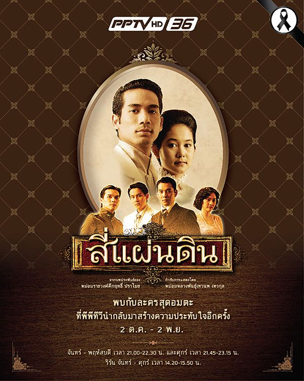 ติดตามชม “สี่แผ่นดิน” ในฉบับสมบูรณ์แบบ ด้วยภาพความคมชัดสูง และงดงามกว่าเดิม ได้ทุกวันจันทร์-พฤหัสบดี เวลา 21.00 – 22.30 น. และศุกร์ เวลา 21.45-23.15 น. ทาง พีพีทีวี เอชดี ช่อง 36 และรับชมผ่านทางออนไลน์ได้ที่ www.pptvhd36.com เริ่มตอนแรกจันทร์ที่2 ตุลาคมนี้เป็นต้นไป