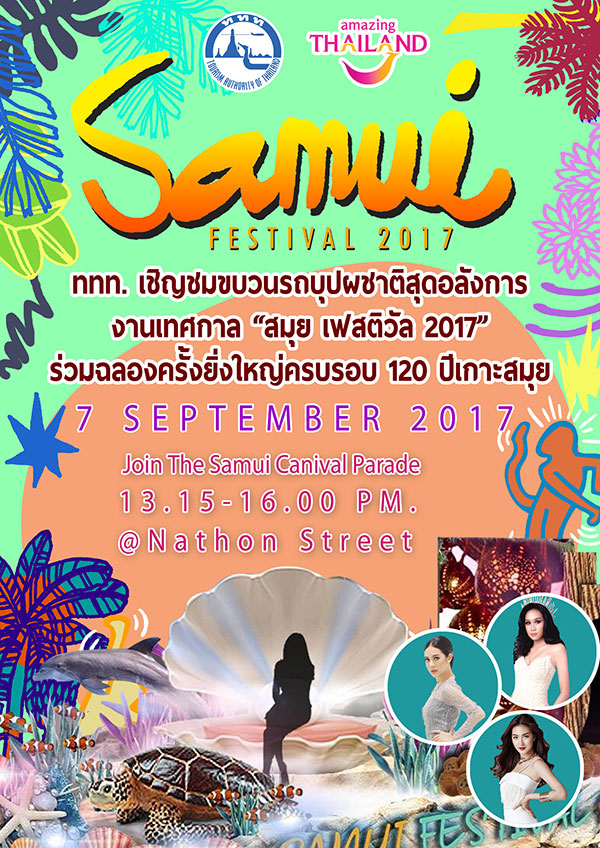 การท่องเที่ยวแห่งประเทศไทย (ททท.) ร่วมกับองค์การบริหารส่วนจังหวัดสุราษฎร์ธานี เทศบาลนครเกาะสมุย เชิญชมขบวนรถบุปผชาติและร่วมพิธีเปิดงานเทศกาล “สมุย เฟสติวัล 2017” ครั้งที่ 2 ในวันที่ 7 กันยายนนี้ที่บริเวณรอบตลาดหน้าทอนและลานเอนกประสงค์ช่วงตลาดหน้าทอน