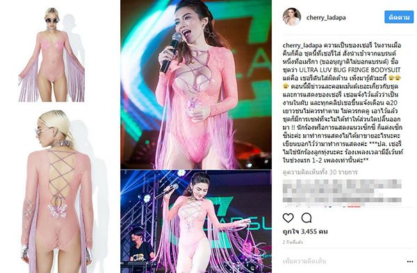 ทำเอาผู้ชมถึงกับตาค้างตาค้าง เมื่อได้เห็นภาพสาวเซ็กซี่สตาร์ตัวแม่อย่าง “เชอรี่ สามโคก” ขึ้นไปร้องเพลงบนเวทีคอนเสิร์ตที่ผับแห่งหนึ่ง ในชุดสีชมพูสุดเซ็กซี่ที่เจ้าตัวสั่งตรงมาจากต่างประเทศเพื่อเอาใจแฟนๆ และงานนี้โดนวิพากษ์วิจารณ์เรื่องชุดแบบเต็มๆ ล่าสุดสาว “เชอรี่” เลยขอออกมาชี้แจงว่า…“ความเปิ่นของเชอรี่ ในงานเมือคืนก็คือ ชุดนี้ที่เชอรี่ใส่ สั่งนำเข้าจากแบรนด์หนึ่งที่อเมริกา (ขออนุญาตไม่บอกแบรนด์) ชื่อชุดว่า ULTRA LUV BUG FRINGE BODYSUIT แต่คือ เชอรี่ดันใส่ผิดด้าน เพิ่งมารู้ตัวมะกี้ ตอนนี้มีข่าวและคอมเม้นท์เยอะเกี่ยวกับชุด และการแสดงของเชอรี่ เชอแจ้งไว้แล้วว่าเป็นงานในผับ และทุกคลิปเชอขึ้นแจ้งเตือน ฉ 20 เยาวชนไม่ควรทำตาม ไม่ควรกดดูเอาไว้แล้วชุดก็มีการเซฟที่จะไม่ได้ทำให้ส่วนใดปลิ้นออกมา !! นักร้องหรือการแสดงแนวเซ็กซี่ ก็แต่งเซ็กซี่นะคะ มาทำการแสดงไม่ได้มาขายอะไรนะคะ เขียนบอกไว้ว่ามาทำการแสดงค่ะ