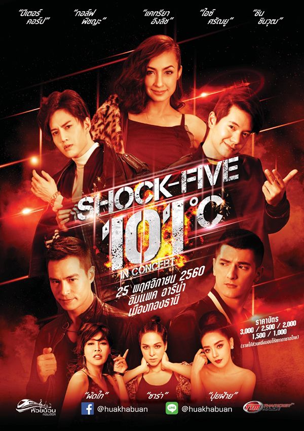 นอกจากคู่จิ้นมวยถูกรุ่นคู่นี้แล้ว ยังมีแต่ศิลปิน นักแสดงชั้นแนวหน้ามาร่วมประชันกันอย่างคับคั่งทั้ง กอล์ฟ พิชญะ, แคท อิงลิช, ไอซ์ ศรัณยู, ชิน ชินวุฒิ ที่จะมาแบทเทิลเดือดกันบนเวทีในคอนเสิร์ตครั้งนี้แน่นอน รวมไปถึงแขกรับเชิญพิเศษที่นอกจากจะเป็น ผัดไท ใจดี แล้วยังมี ซาร่า และสาวปุยฝ้ายอีกด้วย งานนี้นอกจากเวทีจะลุกไปด้วยการแบทเทิล แดนซ์ และ ร็อคแล้ว ยังจะลุกไปด้วยคำพูดอันแสบๆคันๆ ของเหล่าสาวๆ ช่างเม้าท์เหล่านี้อีกด้วยแน่นอน ในคอนเสิร์ตที่เป็นปรากฏการณ์ทะลุองศาเดือดครั้งยิ่งใหญ่ “Shock-Five 101°C ทะลุองศาเดือด” ถือเป็นของขวัญส่งท้ายปี 2560 เลยทีเดียว พร้อมจัดเต็มทุกโชว์และยังร่วมสร้างประโยชน์เพื่อสังคมโดยรายได้ส่วนหนึ่งมอบให้กับสภากาชาดไทย และตอนนี้ยังมีโปรโมชันสุดพิเศษ Early Shock! ลด 10% ทุกราคาทุกที่นั่ง เมื่อซื้อบัตรชมคอนเสิร์ตภายในวันที่ 30 กันยายน 2560 และลด 15% สำหรับนักเรียน-นักศึกษา เพียงแสดงบัตรประจำตัวประชาชนคู่กับบัตรประจำตัวนักเรียน-นักศึกษาที่เคาร์เตอร์ไทยทิกเก็ทเมเจอร์(TTM) ทุกสาขา หมดเขตโปรโมชันวันที่ 30 กันยายน 2560 โดยคอนเสิร์ต “SHOCK-FIVE 101°C ทะลุองศาเดือด” กำหนดจัดแสดงในวันเสาร์ที่ 25 พฤศจิกายน 2560 ที่ อิมแพค อารีน่า เมืองทองธานี เริ่มเวลา 19:00 น. หรือสอบถามทุกสิ่งอย่างที่ Line@ หัวขบวน”