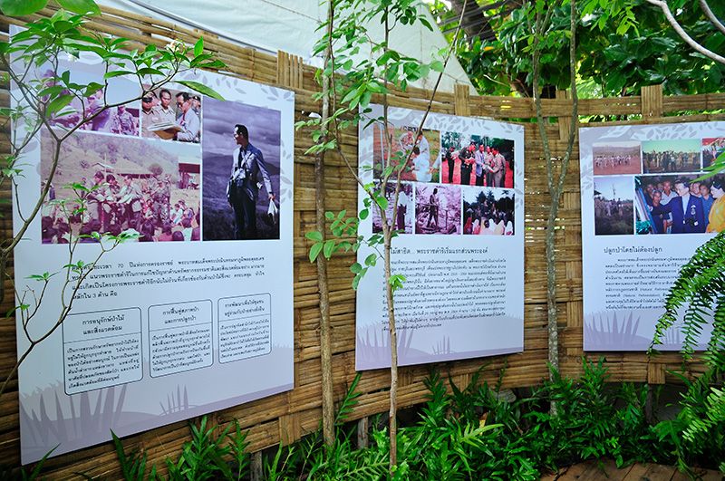 สำหรับบริเวณการจัดแสดงนิทรรศการในครั้งนี้ ประกอบด้วย พระราชกรณียกิจของพระบาทสมเด็จพระปรมินทรมหาภูมิพลอดุลยเดชบรมนาถบพิตร ด้านป่าและดิน พระองค์ทรงเป็นปราชญ์ด้านป่าและดิน พระราชทานแนวพระราชดำริในเรื่องของการปลูกป่า อาทิ การปลูกป่าในใจคน การฟื้นฟูสภาพป่าด้วยวัฏจักรธรรมชาติ การปลูกป่าทดแทน การปลูกป่า 3 อย่าง ประโยชน์4 อย่าง ป่าพรุ และป่าชายเลน พร้อมทั้งแสดงให้เห็นถึงผลสำเร็จที่เป็นรูปธรรมแล้วจากศูนย์ศึกษาการพัฒนาอันเนื่องมาจากพระราชดำริต่างๆ ทั่วประเทศ