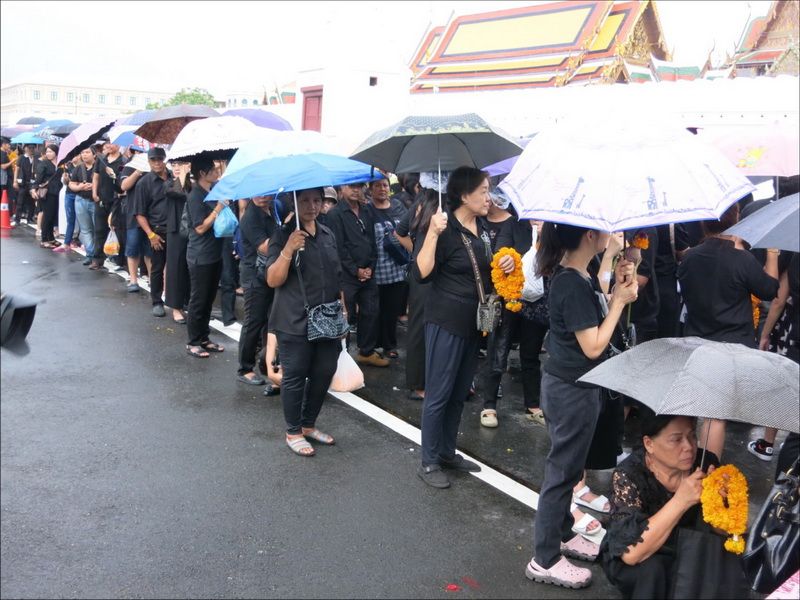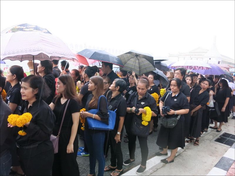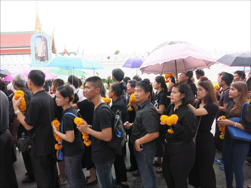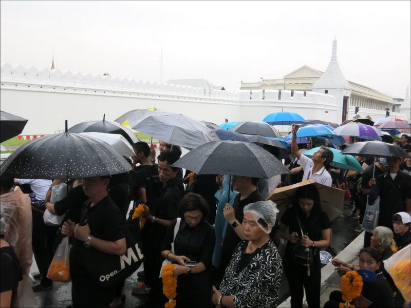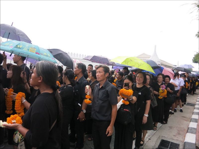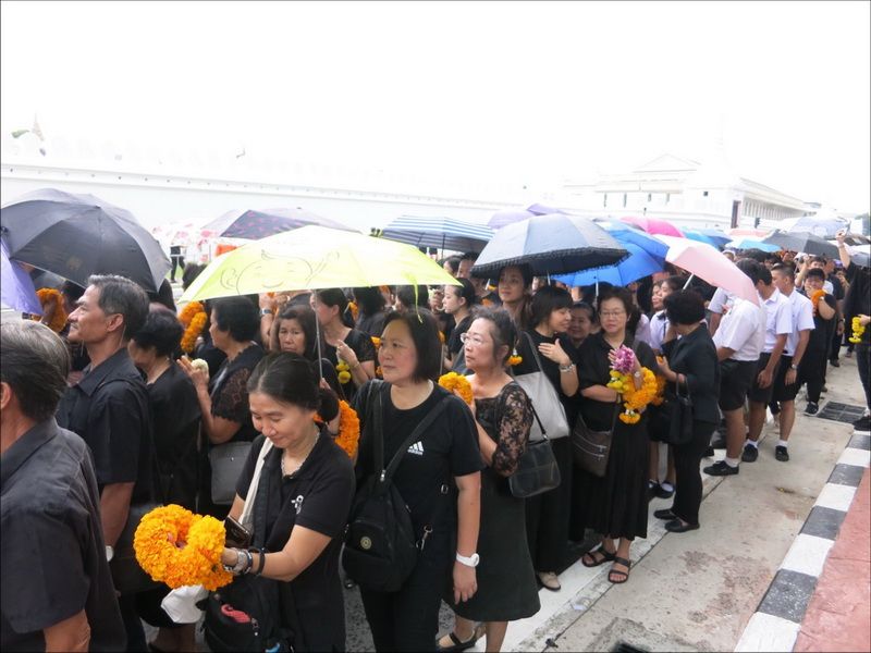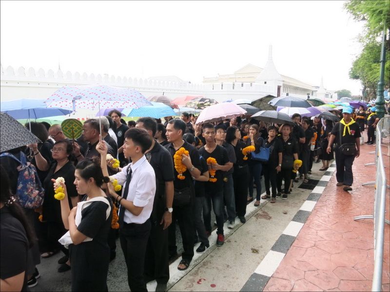 13 ต.ค.60 ผู้สื่อข่าวรายงานบรรยากาศ บริเวณหน้าพระราชวัง เมื่อช่วงบ่ายที่ผ่านมา ประชาชนแต่งกายสีดำเดินทางหลั่งไหลมาเข้ากราบสักการะและถวายดอกไม้สดและพวงมาลัยเบื้องหน้าพระบรมฉายาลักษณ์ ในหลวงรัชกาลที่ 9 อย่างเนืองแน่น ถึงแม้วันจะตกโปรยปรายลงมาอย่างงต่อเนื่อง โดยท้ายแถวประชาชนที่รอผ่านจุดคัดกรองทางฝั่งศาลหลักเมือง ข้างกระทรงกลาโหม มีแถวยาวไปถึงหน้ากระทรวงมหาดไทย และที่ผ่านเข้าจุดคัดกรองมาแล้วมีแถวยาวเกือบถึงศาลฎีกา ส่วนจุดคัดกรองฝั่งท่าช้าง แบ่งออกเป็นสองสาย โดยสายแรกท้ายแถวของประชาชนยาวผ่านมหาวิทยาลัยศิลปากร ถนนมหาราชยาวไปจนถึงมหาวิทยาลัยธรรมศาสตร์ ส่วนอีกสายจากแยกท่าช้าง เลี้ยวซ้ายไปตามถนนมหาราชยาวไปจนถึงท่าเตียน