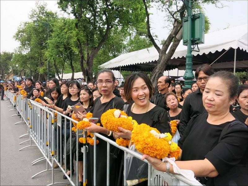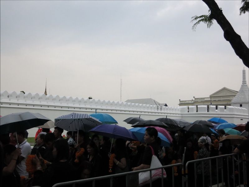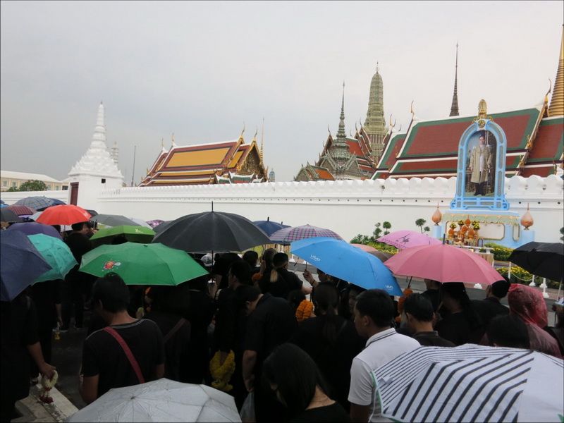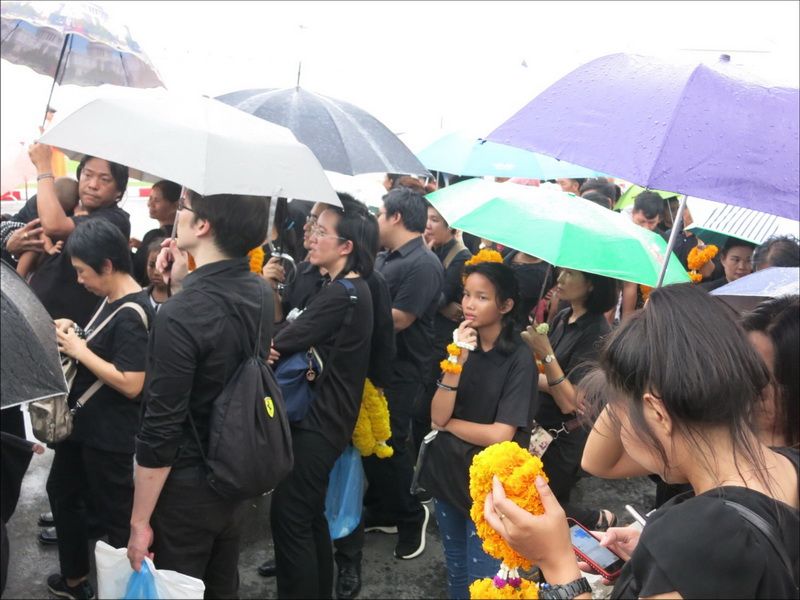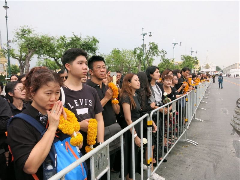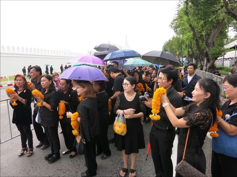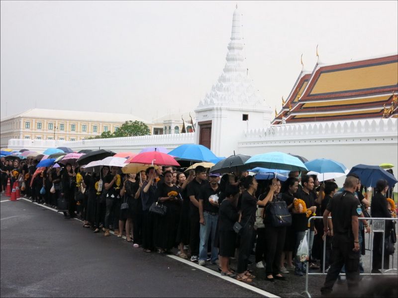 13 ต.ค.60 ผู้สื่อข่าวรายงานบรรยากาศ บริเวณหน้าพระราชวัง เมื่อช่วงบ่ายที่ผ่านมา ประชาชนแต่งกายสีดำเดินทางหลั่งไหลมาเข้ากราบสักการะและถวายดอกไม้สดและพวงมาลัยเบื้องหน้าพระบรมฉายาลักษณ์ ในหลวงรัชกาลที่ 9 อย่างเนืองแน่น ถึงแม้วันจะตกโปรยปรายลงมาอย่างงต่อเนื่อง โดยท้ายแถวประชาชนที่รอผ่านจุดคัดกรองทางฝั่งศาลหลักเมือง ข้างกระทรงกลาโหม มีแถวยาวไปถึงหน้ากระทรวงมหาดไทย และที่ผ่านเข้าจุดคัดกรองมาแล้วมีแถวยาวเกือบถึงศาลฎีกา ส่วนจุดคัดกรองฝั่งท่าช้าง แบ่งออกเป็นสองสาย โดยสายแรกท้ายแถวของประชาชนยาวผ่านมหาวิทยาลัยศิลปากร ถนนมหาราชยาวไปจนถึงมหาวิทยาลัยธรรมศาสตร์ ส่วนอีกสายจากแยกท่าช้าง เลี้ยวซ้ายไปตามถนนมหาราชยาวไปจนถึงท่าเตียน