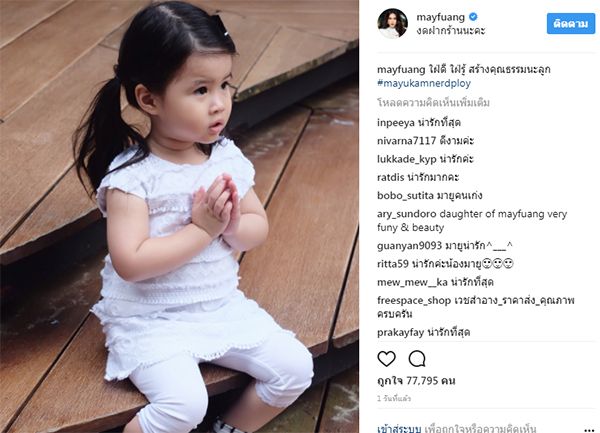 หลังจากโกนผมบวชเพื่อถวายเป็นพระราชกุศลแด่ ในหลวง รัชกาลที่ 9 ด้วยความตั้งใจและศรัทธา ณ เสถียรธรรมสถาน เพื่อนพี่น้องทั้งในและนอกวงการต่างเดินทางแวะเวียนกันมาทำบุญและร่วมอนุโมทนาบุญกับ แม่ชีหนิง ปณิตา ซึ่งล่าสุด เมย์ เฟื่องอารมย์ ก็ขอจูงมือ น้องมายู มาทำบุญถวายเพลให้ แม่ชีหนิง งานนี้ น้องมายู นั่งพนมมือไหว้ฟังสวดอย่างตั้งใจ ซึ่ง แม่เมย์ โพสต์ภาพลูกสาวตัวน้อยพร้อมแคปชั่นว่า “ใฝ่ดี ใฝ่รู้ สร้างคุณธรรมนะลูก” ช่างน่ารักน่าเอ็นดูจริงๆ