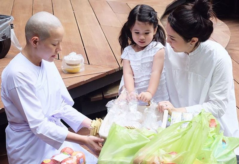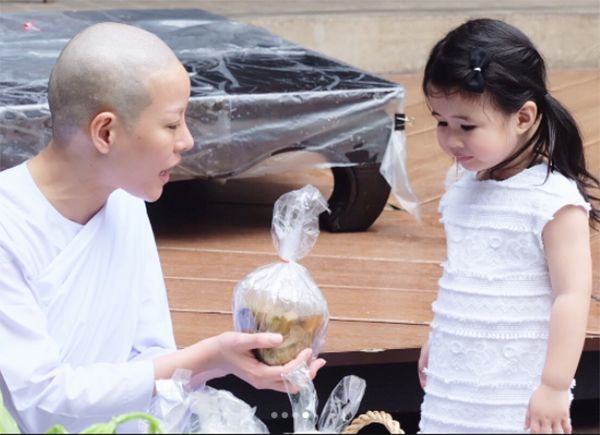 ‘เมย์’จูงมือ’น้องมายู’ทำบุญถวายเพล’แม่ชีหนิง’
