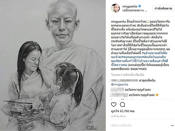 “สึกแล้วนะเจ้าคะ ขออนุโมทนากับทุกๆคนเลยนะเจ้าคะ มันคือช่วงชีวิตที่ดีที่สุดในชีวิตช่วงนึง หนิงต้องขอโทษนะคะที่ไม่ได้บอกกล่าวกัน มาเปิดข้อความดูเยอะมากกกกกก ทุกอย่างไม่ได้เตรียมตัวล่วงหน้า ตัดสินใจกะทันหันมากค่ะ ชีวิตนี้ไม่คิดว่าตัวเองจะได้มีโอกาสทำสิ่งที่ดีที่สุดในชีวิตแบบนี้และจะกล้าทำและทำได้ รู้สึกอยากอยู่ต่ออีกนาน ๆๆๆๆๆๆ แต่ด้วยงานที่เคลียร์ได้แค่นี้”