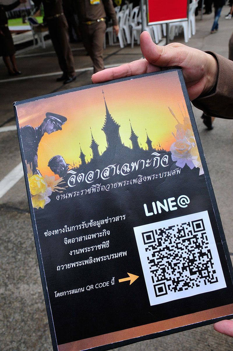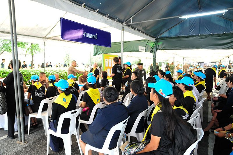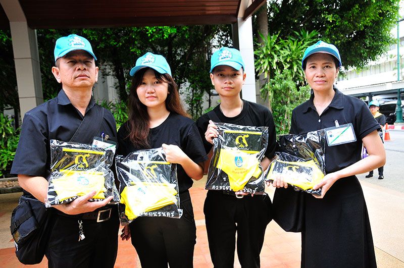 บรรยากาศการเข้ารับชุดปฏิบัติงานพระราชทานของจิตอาสาเฉพาะกิจ ในวันที่ 7 ตุลาคม 2560 ซึ่งเป็นวันแรก ณ อาคาร 601 สำนักพระราชวัง เป็นไปอย่างคึกคัก มีจิตอาสาเฉพาะกิจมาเข้าคิวรอตั้งแต่เช้า สำหรับ “จิตอาสาเฉพาะกิจ งานพระราชพิธีถวายพระเพลิงพระบรมศพ” แบ่งเป็น 8 ประเภท ได้แก่ งานดอกไม้จันทน์ งานประชาสัมพันธ์ งานโยธา งานขนส่งเพื่อความปลอดภัยของประชาชน งานบริการประชาชน งานแพทย์ งานรักษาความปลอดภัย และงานจราจร โดยจิตอาสาเฉพาะกิจจะปฏิบัติหน้าที่ในช่วงก่อน ระหว่างและหลังงานพระราชพิธีถวายพระเพลิงพระบรมศพ ระหว่างวันที่ 18-31 ตุลาคม 2560