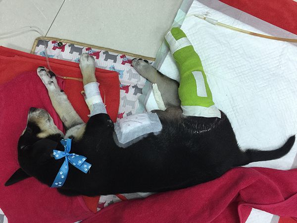 อาการเบื้องต้นหนักมาก หมาเด็กอายุ 2-3 เดือนเองมั๊ง ระหว่างทางที่มารพส. หมาเหมือยจะช็อค คงเจ็บปวดมาก ตัวเย็น เหงือกซีดขาว มือเท้าเย็นเฉียบ จั่นนั่งอุ้มมาก็ปลุกให้เค้าตื่นอยู่ตลอด จนถึงรพส. หมอบอกหมาเกือบช็อคไปเหมือนกันนะ ถ้าเราไม่พามาหมาคงไม่พ้นคืนนี้เพราะทนพิษบาดแผลไม่ไหว สรุปคือกระดูกขาหลังซ้ายหักแตกหลายจุด กระดูกเชิงกรานหักแยกออกจากกัน กระดูกขาหลังขวาหลุดออกจากเบ้าสะโพก กระเพาะปัสสาวะเสียหาย ท่อปัสสาวะมีรอยฉีกเกือบขาด ผนังช่องท้องด้านในฉีกขาดจนทำให้ไส้ไหลออกมากองอยู่ช่วงก้น มีการตกเลือดภายในเยอะมากจนต้องวิ่งหาเลือดกันเดี๋ยวนั้น จั่นก็ลงไอจีประกาศหาเลือด พี่น้องในวงการก็น่ารักมากช่วยจั่นแชร์กันเยอะ ไม่ว่าจะอาหน่อง พลากร พี่ตุ๊กตา กันตนา พี่อั้ม พัชราภา พี่บุ๋ม ปนัดดา พี่เก๋ ชลลดา น้องออม สุชาร์ น้ำหวาน เดอะเฟส และอีกหลายๆท่านที่เอ่ยไม่หมดค่ะ จั่นขอบคุณมากๆนะคะ