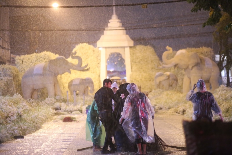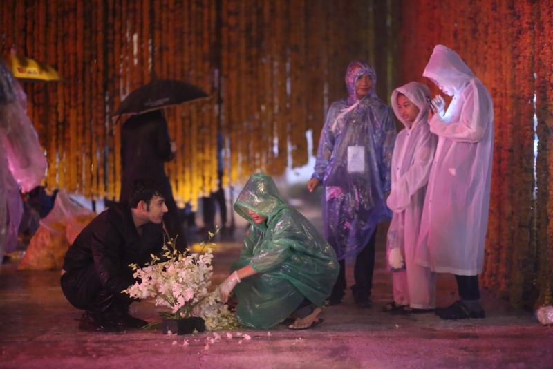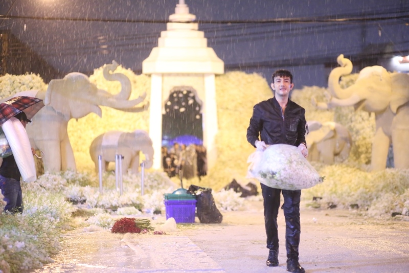 โดย “ดอกไม้ของพ่อ” ปิดซ่อมแซมในช่วงเวลา 18.00-24.00 น. ซึ่งในช่วงเวลาที่ซ่อมแซมอยู่นั้น ฝนตกลงมาอย่างหนักถึ 2-3 รอบ แต่บรรดาดาราจิตอาสาก็ไม่หวั่น ลุยฝนกันสุดพลัง โดยเฉพาะ นนท์ ภูดิศ ที่ยอมเปียกลุยฝนช่วยกันซ่อมแซมซุ้มดอกไม้ เพื่อเสร็จให้ทันในช่วงเวลา 24.00 น. สุดยอดจริงๆ
