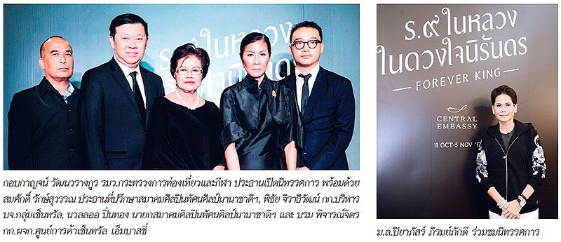 ด้วยสำนึกในพระมหากรุณาธิคุณเป็นล้นพ้นหาที่สุดมิได้ และด้วยความอาลัยยิ่งใน “พระบาทสมเด็จพระปรมินทรมหาภูมิพลอดุลยเดช บรมนาถบพิตร” ทาง สมาคมศิลปินทัศนศิลป์นานาชาติ แห่งประเทศไทย จับมือ ศูนย์การค้าเซ็นทรัล เอ็มบาสซี่ เปิดนิทรรศการศิลปกรรม “ร.๙ ในหลวงในดวงใจนิรันดร” แสดงผลงานศิลปะอันทรงคุณค่า พระบรมสาทิสลักษณ์ และผลงานที่ได้แรงบันดาลใจจากพระราชจริยวัตร และพระราชกรณียกิจ รวมถึงภาพเชิงสัญลักษณ์ มากกว่า 50 ผลงาน โดย 50 ศิลปินแห่งชาติและศิลปินชั้นแนวหน้าของไทยที่จรดปลายพู่กันสร้างสรรค์ด้วยหัวใจแห่งความจงรัก ภักดี แสนอาลัย พร้อมชวนบริจาคเพื่อรับสูจิบัตรที่ระลึกรวมภาพผลงาน เพื่อนำรายได้สมทบมูลนิธิชัยพัฒนา