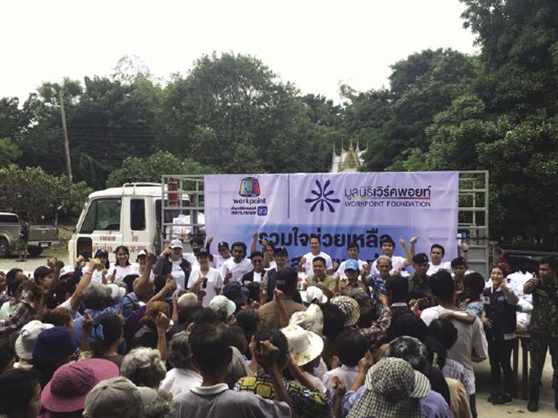 มูลนิธิเวิร์คพอยท์ นำทีมจิตอาสา ศิลปินนักแสดง อาทิ พัน พลุแตก, นัท มาลิสา (ไมค์ทองคำ) และ ถั่วงอก ซูเปอร์หม่ำ นำถุงยังชีพลงพื้นที่ช่วยเหลือผู้ประสบภัยน้ำท่วมใน 3 อำเภอ ของ จ.พระนครศรีอยุธยา โดยนำไปมอบให้กับชาวบ้าน ต.ท่าดินแดง อ.ผักไห่, ต.กบเจา อ.บางบาล และ ต.สามกอ อ.เสนา ซึ่งทั้ง 3 อำเภอนี้ มีผู้ประสบภัยน้ำท่วมมากกว่า 1,000 หลังคาเรือน ซึ่งชาวบ้านแต่ละหลังคาเรือนได้รับผลกระทบจากน้ำท่วมต่างใช้ชีวิตประจำวันแบบยากลำบาก นอกจากการนั่งเรือไปมอบถุงยังชีพให้ถึงบ้าน เหล่าศิลปินยังพร้อมใจกันมอบความสุขด้วยเสียงหัวเราะและเสียงเพลง เพื่อคลายเครียดและเป็นกำลังใจให้กับผู้ประสบภัยทุกคน เรียกได้ว่าเป็นการลงพื้นที่ ที่ได้รับความสุขทั้งผู้ให้และผู้รับ