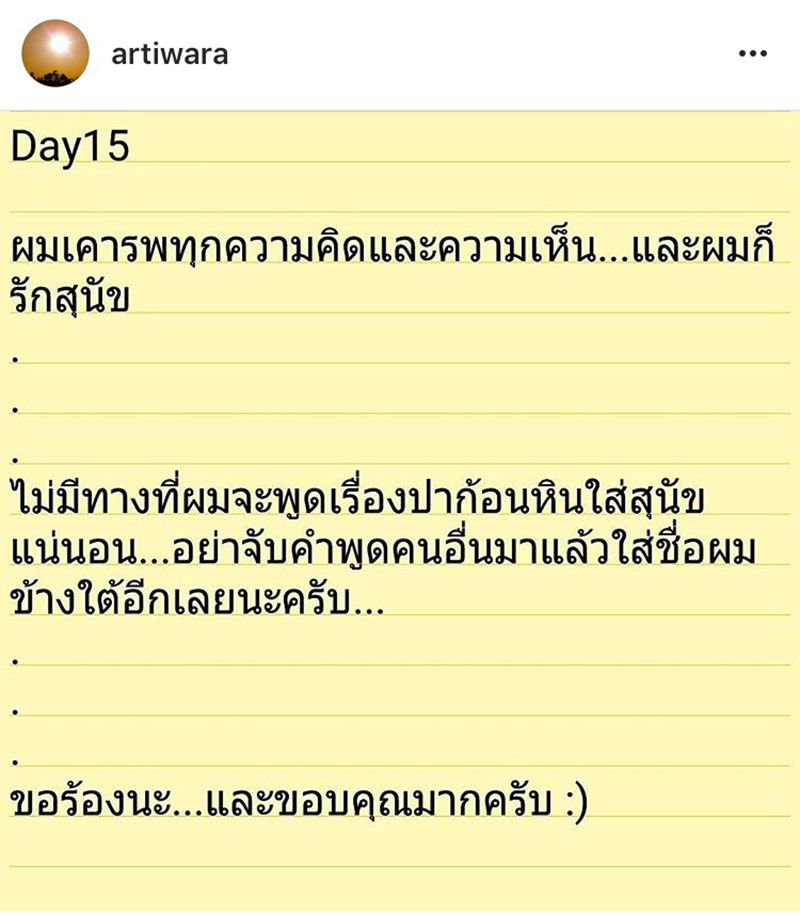 ล่าสุด หนุ่มตูนก็ได้ชี้แจงผ่านอินสตาแกรมส่วนตัวว่า “Day 15 ผมเคารพทุกความคิดและความเห็น…และผมก็รักสุนัข …. ไม่มีทางที่ผมจะพูดเรื่องปาก้อนหินใส่สุนัขแน่นอน…อย่าจับคำพูดคนอื่นแล้วมาใส่ชื่อผมข้างใต้อีกเลยนะครับ….ขอร้องนะ…และขอบคุณมากครับ”