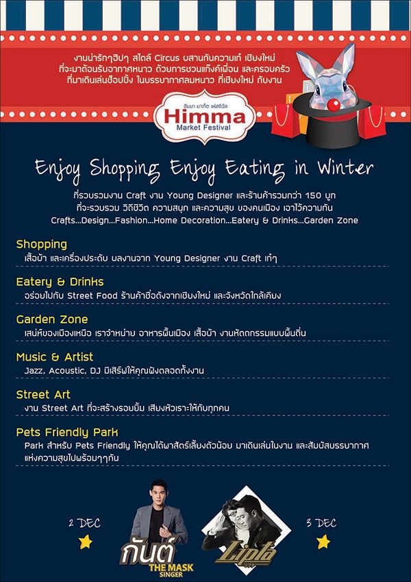 หนาวนี้หากใครยังไม่มีแพลนไปไหน มาเดินเล่นรับลมหนาวกันในบรรยากาศแบบชิคๆที่เชียงใหม่กับงานเฟสติวัลน้องใหม่ล่าสุด“HIMMA MARKET FESTIVAL”ที่จะจัดขึ้นในวันเสาร์ที่ 2 และ วันอาทิตย์ที่ 3 ธันวาคมนี้งานน่ารักสุดฮิปสไตล์ Circus ที่เหมาะสำหรับคนทุกเพศทุกวัยซึ่งเป็นงานที่รวบรวม Lifestyle ต่างๆไว้ในที่เดียวกันใน 6 โซน ไม่ว่าจะเป็น กิจกรรม Street Art การออกร้านสินค้าเครื่องประดับแฟชั่น งาน Craft เก๋ๆ ผลงานของเหล่า Young designer สินค้าพื้นเมืองStreet Food ชื่อดังทั้งในเชียงใหม่และจากกรุงเทพ กว่า 150 บูธ พร้อมด้วยดนตรี Jazz และ Acoustic ที่จะคอยบรรเลงขับกล่อมตลอดงาน และสามารถพาสัตว์เลี้ยงตัวโปรดมาเดินเล่นได้ด้วย ที่สำคัญยังจะได้พบกับแขกรับเชิญสุดพิเศษ กันต์ กันตถาวร และ วงลิปตา ที่จะมาเพิ่มสีสันและความสนุกในงานเรียกได้ว่ามางานนี้งานเดียวได้ความสุขครบทุกอรรถรสอย่างแน่นอน โดย หนุ่มกันต์ อาสามาชวนทุกคนไปชิลรับลมหนาวด้วยกัน