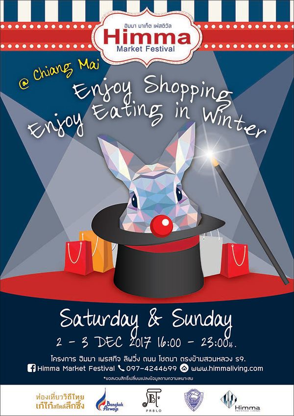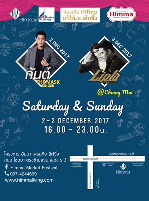 หนาวนี้หากใครยังไม่มีแพลนไปไหน มาเดินเล่นรับลมหนาวกันในบรรยากาศแบบชิคๆที่เชียงใหม่กับงานเฟสติวัลน้องใหม่ล่าสุด“HIMMA MARKET FESTIVAL”ที่จะจัดขึ้นในวันเสาร์ที่ 2 และ วันอาทิตย์ที่ 3 ธันวาคมนี้งานน่ารักสุดฮิปสไตล์ Circus ที่เหมาะสำหรับคนทุกเพศทุกวัยซึ่งเป็นงานที่รวบรวม Lifestyle ต่างๆไว้ในที่เดียวกันใน 6 โซน ไม่ว่าจะเป็น กิจกรรม Street Art การออกร้านสินค้าเครื่องประดับแฟชั่น งาน Craft เก๋ๆ ผลงานของเหล่า Young designer สินค้าพื้นเมืองStreet Food ชื่อดังทั้งในเชียงใหม่และจากกรุงเทพ กว่า 150 บูธ พร้อมด้วยดนตรี Jazz และ Acoustic ที่จะคอยบรรเลงขับกล่อมตลอดงาน และสามารถพาสัตว์เลี้ยงตัวโปรดมาเดินเล่นได้ด้วย ที่สำคัญยังจะได้พบกับแขกรับเชิญสุดพิเศษ กันต์ กันตถาวร และ วงลิปตา ที่จะมาเพิ่มสีสันและความสนุกในงานเรียกได้ว่ามางานนี้งานเดียวได้ความสุขครบทุกอรรถรสอย่างแน่นอน โดย หนุ่มกันต์ อาสามาชวนทุกคนไปชิลรับลมหนาวด้วยกัน