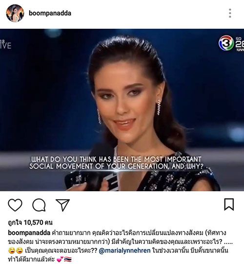 ถึงจะเป็นนางงามคนละเวที แต่รุ่นพี่นางสาวไทยอย่าง “บุ๋ม” ปนัดดา วงศ์ผู้ดี ถึงกับโพสต์ในอินสตาแกรมส่วนตัว “boompanadda” เอ่ยปากชมตัวแทนสาวไทย อย่างสาว”มารีญา พูลเลิศลาภ” นั้นเจอคำถามปราบเซียนมากๆ