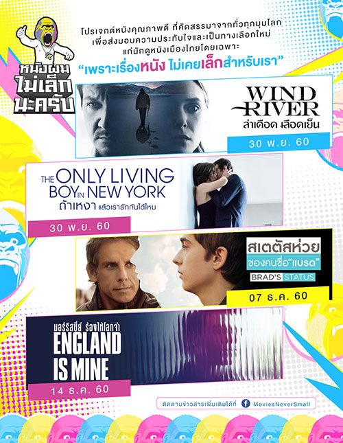 จัดมาเอาใจคอหนังอย่างแท้จริง กับโปรเจกท์ “หนังผมไม่เล็กนะครับ” ของค่ายหนัง เอ็ม พิคเจอร์ส ที่รวมเอาหนังดีมีคุณภาพมาส่งต่อความประทับใจ และเพิ่มทางเลือกใหม่แก่นักดูหนังเมืองไทยโดยเฉพาะ ซึ่งล่าสุดได้จัดงานเปิดตัวโปรเจกท์อย่างเป็นทางการ พร้อมส่งภาพยนตร์คุณภาพ 4 เรื่อง 4 รส เอาใจคอหนังชาวไทยโดยเฉพาะ ประกอบด้วยภาพยนตร์ WIND RIVER ล่าเดือด เลือดเย็น, THE ONLY LIVING BOY IN NEW YORK ถ้าเหงา แล้วเรารักกันได้ไหม, BRAD’S STATUS สเตตัสห่วยของคนชื่อแบรด และ ENGLAND IS MINE มอร์ริสซี่ย์ ร้องให้โลกจำ โดยมีตัวแทนจากแต่ละเรื่อง อาทิ โขม-ก้องเกียรติ, ทอย-ปฐมพงศ์, กาย-รัชชานนท์, บอล-วงสครับบ์ มาร่วมพูดคุย