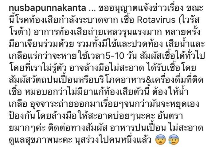 ป่วยเปิดศักราชใหม่กันเลยทีเดียวสำหรับนักแสดงมากฝีมืออย่าง นุสบา ปุณณกันต์ ที่ล่าสุดติดเชื้อ ไวรัสโรต้า (Rotavius) โรคท้องเสียที่กำลังแพร่ระบาดอยู่ในขณะนี้ โดยเจ้าตัวมีอาการท้องเสียถ่ายเหลวอย่างรุนแรงหลายครั้งร่วมกับอาการอาเจียน มีไข้และปวดท้อง เรียกว่าหนักเอาการถึงขั้นทำให้ต้องแอดมิทโรงพยาบาล