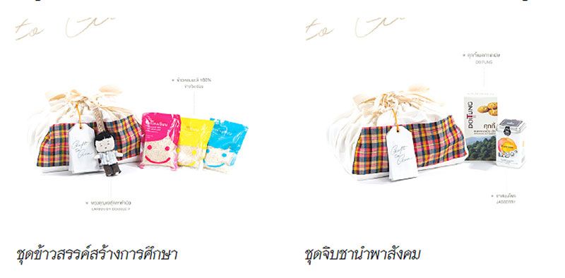 ชุดของขวัญที่จัดเตรียมไว้มีทั้งหมด 7 ชุด ได้แก่ ชุดบันทึกความห่วงใย Set A 2,500 บาท, ชุดใส่ใจใส่กระเป๋า Set B 2,500 บาท, ชุดป่าเขาที่เราแคร์ SetC 2,500 บาท, ชุดดริปกาแฟดูแลป่า SetD 1,250 บาท,ชุดแบ่งปันพลังฝัน Set E 1,250 บาท,ชุดข้าวสรรค์สร้างการศึกษา SetF 750 บาท และ ชุดจิบชานำพาสังคม