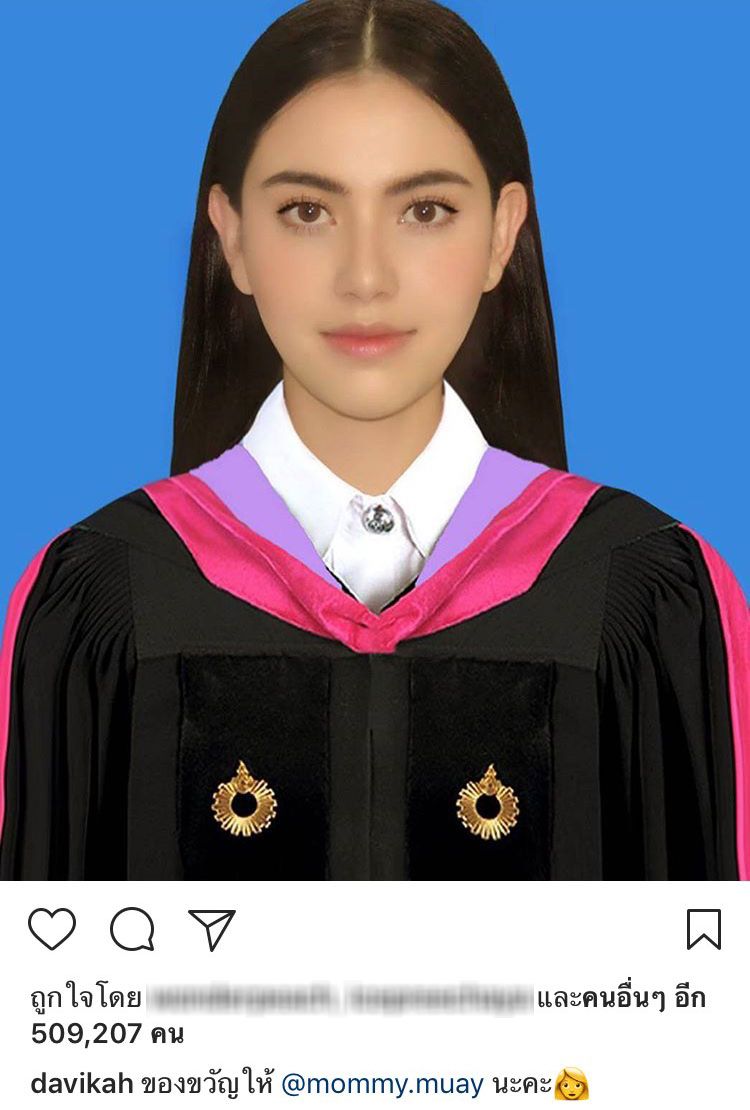 โดยสาวใหม่ ได้โพสต์ภาพสวมชุดครุย ประกาศข่าวดีว่าเรียนจบปริญญาตรีเป็นที่เรียบร้อยแล้ว พร้อมข้อความว่า “ของขวัญให้ @mommy.muay นะคะ” งานนี้ต้องขอปรบมือให้รัวๆ ทั้งสวยทั้งเก่ง แม้คิวงานจะแน่นขนาดไหนก็จบนะจ๊ะ