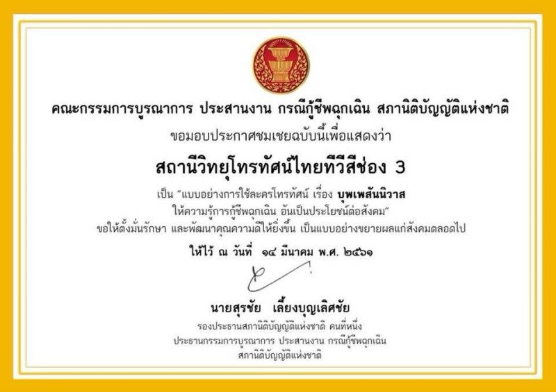 จนล่าสุดจ้า คณะกรรมการบูรณาการ ประสานงาน กรณีกู้ชีพฉุกเฉิน สภานิติบัญญัติแห่งชาติ ได้มอบประกาศนียบัตรให้แก่ช่อง 3 ในฐานะที่เป็นแบบอย่างในการใช้ละครโทรทัศน์เรื่องบุพเพสันนิวาส ให้ความรู้การกู้ชีพฉุกเฉิน อันเป็นประโยชน์ต่อสังคม