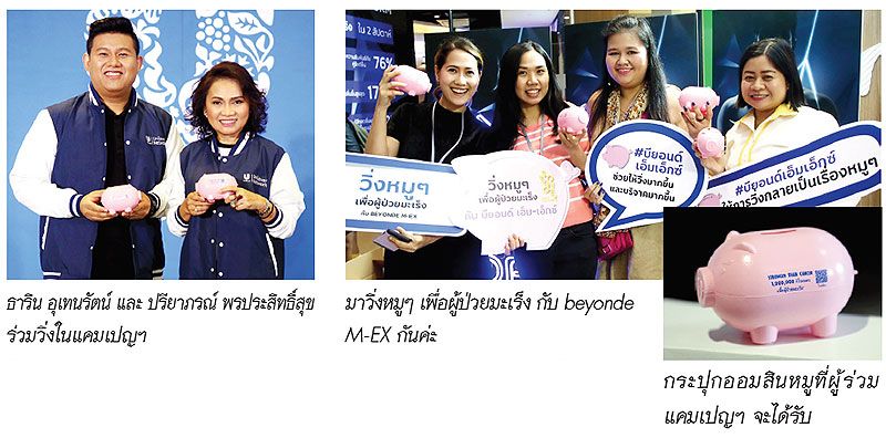 แคมเปญ “วิ่งหมูๆ เพื่อผู้ป่วยมะเร็ง กับ beyonde M-EX” ชวนทุกคนมาร่วมบริจาคเงินด้วยการออกกำลังกาย โดยนำสถิติการออกกำลังกายของตัวเราเอง มาเปลี่ยนเป็นเงินบริจาค ทุกๆ 1 กิโลเมตรจะเท่ากับ 1 บาท หยอดลงในกระปุกออมสินหมู โดยในวันที่ 14 มกราคม 2561 จะมาร่วมแสดงพลังด้วยการวิ่ง และชั่งน้ำหนักกระปุกออมสินหมู พร้อมเตรียมส่งมอบเงินบริจาคกระปุกออมสินหมูกว่า 1,000 กระปุกทั้งแคมเปญ ในวันที่ 3 กุมภาพันธ์ 2561 ให้แก่ชมรมเพื่อนมะเร็งไทย เพื่อช่วยเหลือผู้ป่วยมะเร็งให้มีคุณภาพชีวิตที่ดีขึ้น และรณรงค์ให้ผู้ป่วยมะเร็งได้ตื่นตัวในการออกกำลังกาย เพื่อสร้างความแข็งแรงให้แก่ร่างกายในระยะยาว