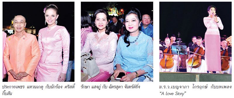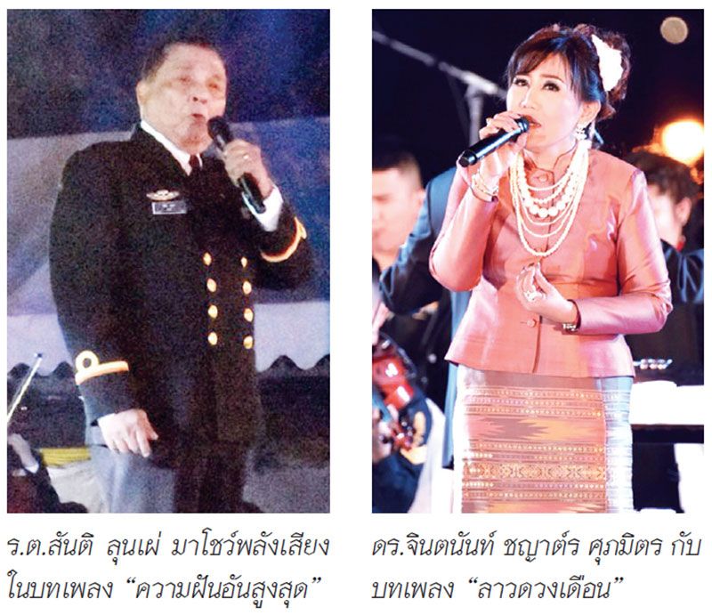 การแสดงคอนเสิร์ต “บทเพลงแห่งข้าวรพุทธเจ้า”บรรเลงโดย วงดุริยางค์ราชนาวี แบ่งออกเป็น 6 ช่วง เริ่มต้นช่วง 1 “สรรเสริญพระบารมี” ได้เริ่มขึ้น โดย ศ.พิเศษ พรเพชร วิชิตชลชัย ประธาน สนช. นำสมาชิก สนช. ร่วมขับร้องเพลงสรรเสริญพระบารมี, เพลงราชาทรงพระเจริญ, เพลงพระบารมีคุ้มไทย (ขับร้องโดย ด.ญ.ณฐมน อรุณประสบสุข) ต่อด้วย ช่วงที่ 2“ดั่งพระราชหฤทัย” ศ.พิเศษ พรเพชร วิชิตชลชัย ขับร้องเพลง “ชะตาชีวิต”, ม.ร.ว.เบญจาภา ไกรฤกษ์ กับบทเพลง “A Love Story” และ เรือตรี สันติ ลุนเผ่ มาโชว์พลังเสียงในบทเพลง “ความฝันอันสูงสุด” จากนั้น ช่วงที่ 3“เย็นศิระเพราะพระบริบาล” มีเพลง นิราศบางกอก เป็นการแสดงจินตลีลาประกอบเพลง, ลาวดวงเดือนขับร้องโดย ดร.จินตนันท์ ชญาต์ร ศุภมิตร, สยามเมืองยิ้มและล้นเกล้าเผ่าไทย ขับร้องโดย คริสตี้ กิ๊บสัน ก่อนจะถึงช่วงที่ 4” สยามศิวิไลซ์” มีการโชว์จากนักแสดงไวโอลิน, ติ๊ก ชีโร่ ด้วยเพลง รักไม่ยอมเปลี่ยนแปลง, มาจอยกัน โดย ติ๊ก ชีโร่ และ ด.ญ.ณฐมน, และ I will Survive ดร.จินตนันท์ ชญาต์ร ศุภมิตร ช่วงที่ 5 “สุขศานต์ ปณิธาน ปวงประชา” ทรายกับทะเล, ขอมือเธอหน่อย ขับร้องโดย ตู่-นันทิดา แก้วบัวสาย, Time to Say Goodbye เรือตรี สันติ ลุนเผ่ และนักเรียนดุริยางหญิง ไหมแพร และมีการแสดงโชว์ประกอบ, ต่อด้วยเพลง Wind Beneath My wings นักเรียนดุริยางหญิง ไหมแพร, และเพลง The Beatles Medley กิตติ วะสีนนท์ และปิดท้าย ช่วงที่ 6 “ดุจถวายชัย ชโย” เพลง อยู่อย่างพอเพียง, คำพ่อสอน ขับร้องโดย อี๊ด วงฟลาย,Jingle Bells และ Santa Claus is Coming to Townม.ร.ว.เบญจาภา ขับร้องร่วมกับสันติและคริสตี้,เพลง รื่นเริงเถลิงศก มีการแสดงกลองยาวและรำวงประกอบและเพลงพระราชนิพนธ์ “พรปีใหม่” เป็นการขับร้องหมู่ปิดท้ายที่สร้างความสุขใจให้กับผู้มาร่วมฟังได้อย่างน่าประทับใจ