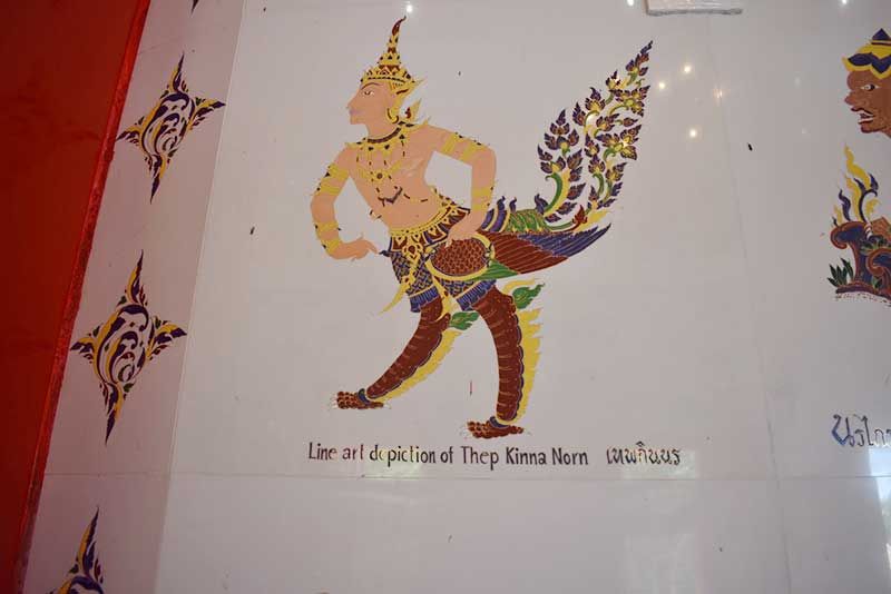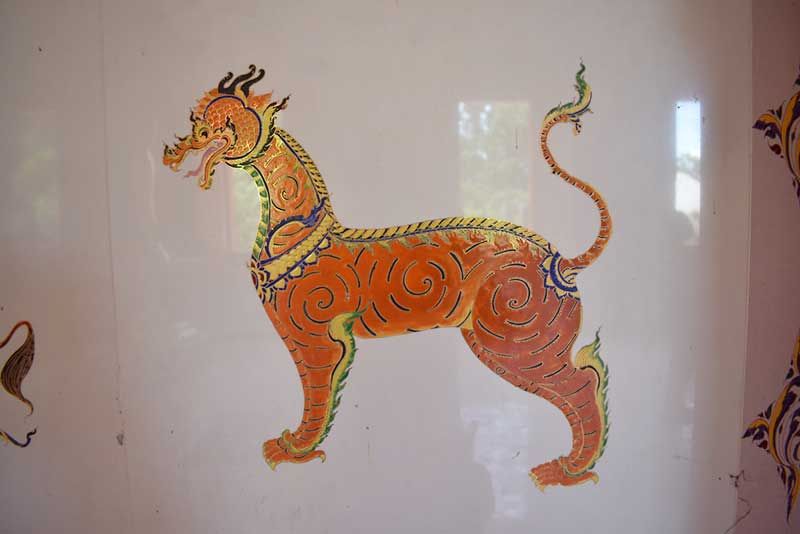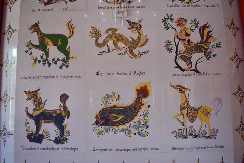 ที่วัดมหานาม ต.ไชยภูมิ อ.ไชโย จ.อ่างทอง ได้มีการสร้างโบสถ์โดยได้มีการใช้กระเบื้องพร้อมลงลวดลายเบญจรงค์และเขียนภาพสัตว์ในป่าหินมพานต์ โดยมีการเขียนชื่อเป็นภาษาไทยและภาษาอังกฤษด้านล่างของภาพเป็นพื้นกระเบื้องสีขาว มีการวาดลวดลายเป็นรูปสัตว์ในตำนานทางพุทธศาสนา ที่นำมาประดับไว้ที่บริเวณผนังโบสถ์ เป็นที่น่าตื่นตาตื่นใจแก่ผู้ที่พบเห็น เป็นภาพวาดที่มีอยู่ในกระเบื้องที่สวยงาม เป็นเอกลักษณ์โดเด่น แล้วยังมีชื่อสัตว์ในตำนานที่เขียนเป็นภาษาไทยและภาษาอังกฤษอยู่คู่กันด้วย เป็นการสร้างสรรค์ผลงานที่ให้ทั้งชาวไทยและต่างประเทศได้ชมอย่างมีความสุขและเข้าใจในวัฒนธรรมเรื่องเล่าในตำนานพุทธศาสนา