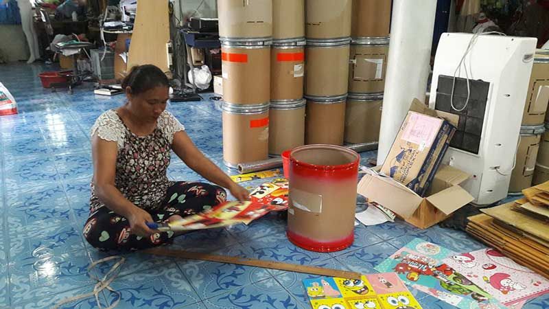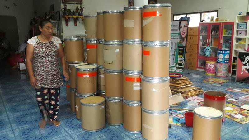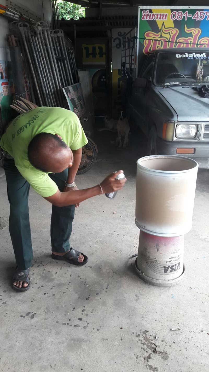 นายเสวย เผยว่าได้ไปสั่งซื้อถังเปล่าที่บรรจุผงยาสีฟันน้ำหนัก 20 กิโลกรัม มาจากโรงงาน ซึ่งถังเปล่าเป็นวัสดุทำจากกระดาษอัดแข็งอย่างดีไม่ยุบ รับน้ำหนักได้ประมาณ 60 กิโลกรัม แล้วลงมือช่วยกันทำกับภรรยาสองคน ซึ่งวัสดุที่ใช้ก็คือถังเปล่า สีสเปรย์ กาวลาเท็กซ์ sticker pvc กันน้ำกันแดด เป็นลายการ์ตูนแบบต่างๆตามที่ลูกค้าจะเลือกสั่ง ซึ่งลายที่ลูกค้าสนใจสั่งทำกันมากก็คือลายโดเรม่อน ส่วนต้นทุนในการทำนั้น ถังเปล่าตกแล้วใบละ 170 บาท แต่ตนทำขายเพียงใบละ 250 บาทเท่านั้น ซึ่งในตอนนี้ออเดอร์ในการสั่งซื้อทางอินเตอร์เน็ตมีจำนวนมาก และกระป๋องออมสินยักษ์ก็ใช้เวลาทำ 40 นาทีเป็นอย่างต่ำ ในแต่ละวันตนทำได้ประมาณ 10 ใบ ซึ่งในตอนนี้ตนทำแทบไม่ทันออเดอร์ เพราะลูกค้าสั่งเยอะแทบทุกวัน ซึ่งการทำกระปุกออมสินนี้ถือเป็นรายได้เสริม ทำให้ตนสามารถหารายได้มาเพิ่มให้แก่ครอบครัวได้ดีเลยทีเดียว